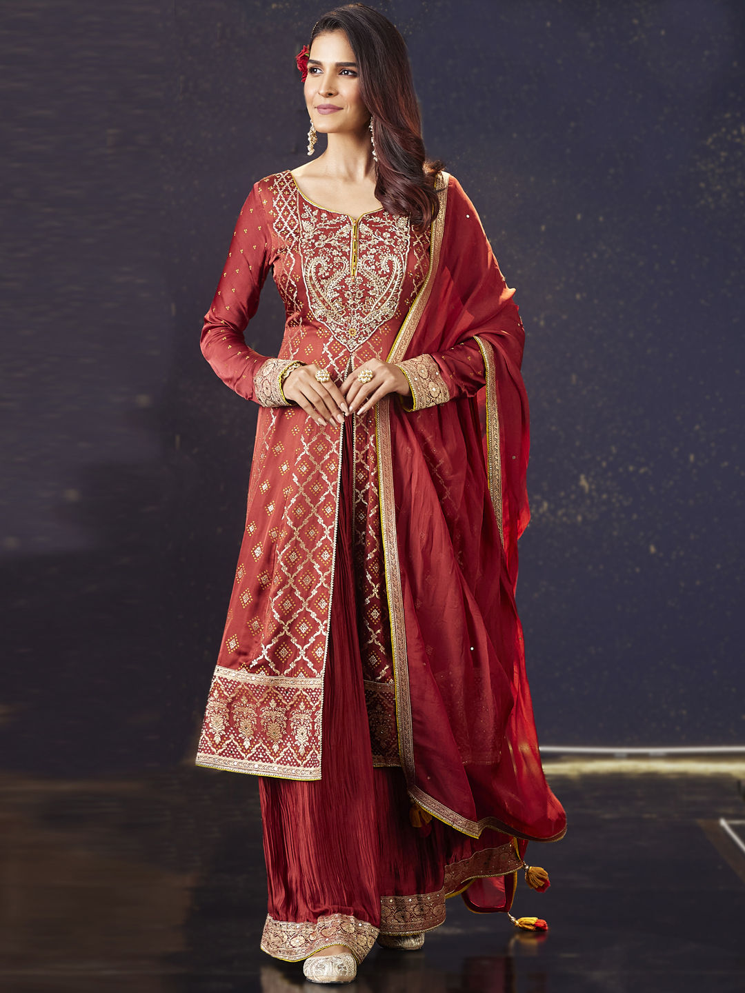 Silk Engagement Salwar Kameez in Red and Maroon with Sequence work