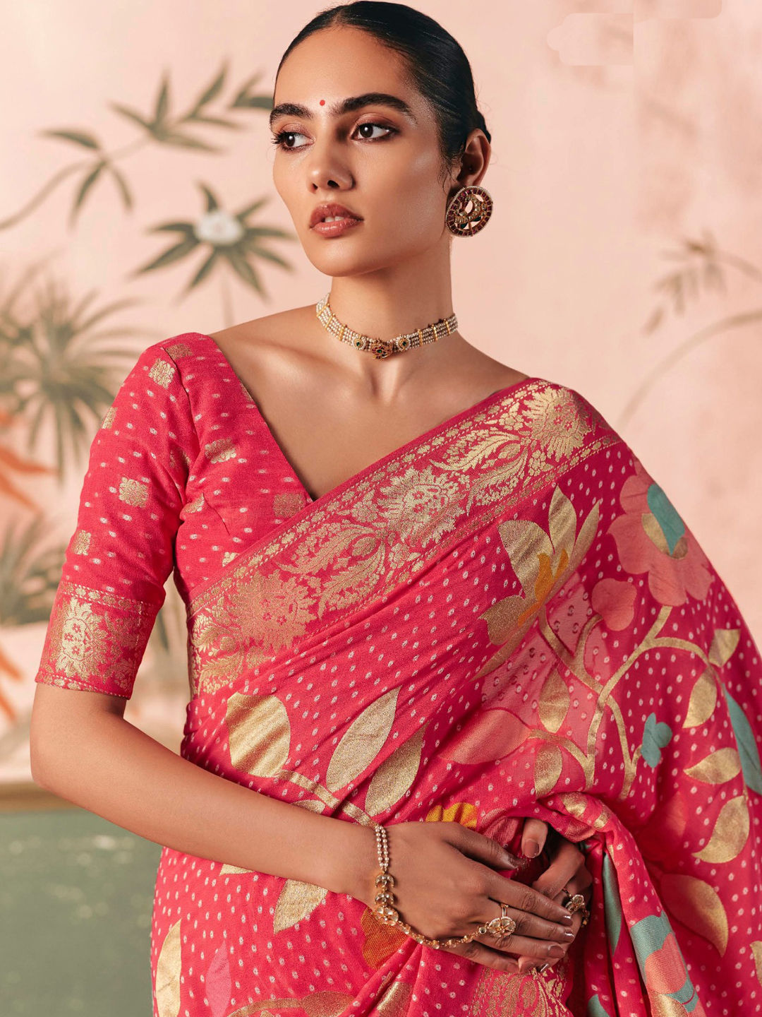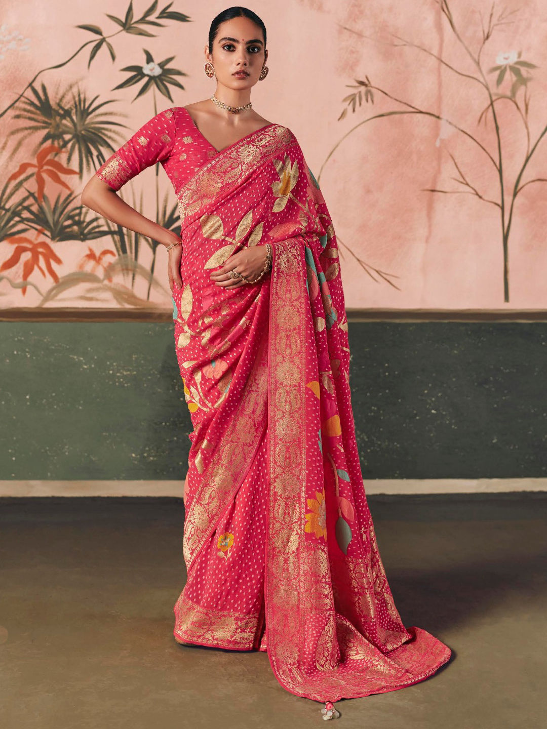 Pink and Majenta color Saree in Silk fabric with Bandhej, Printed, Weaving work