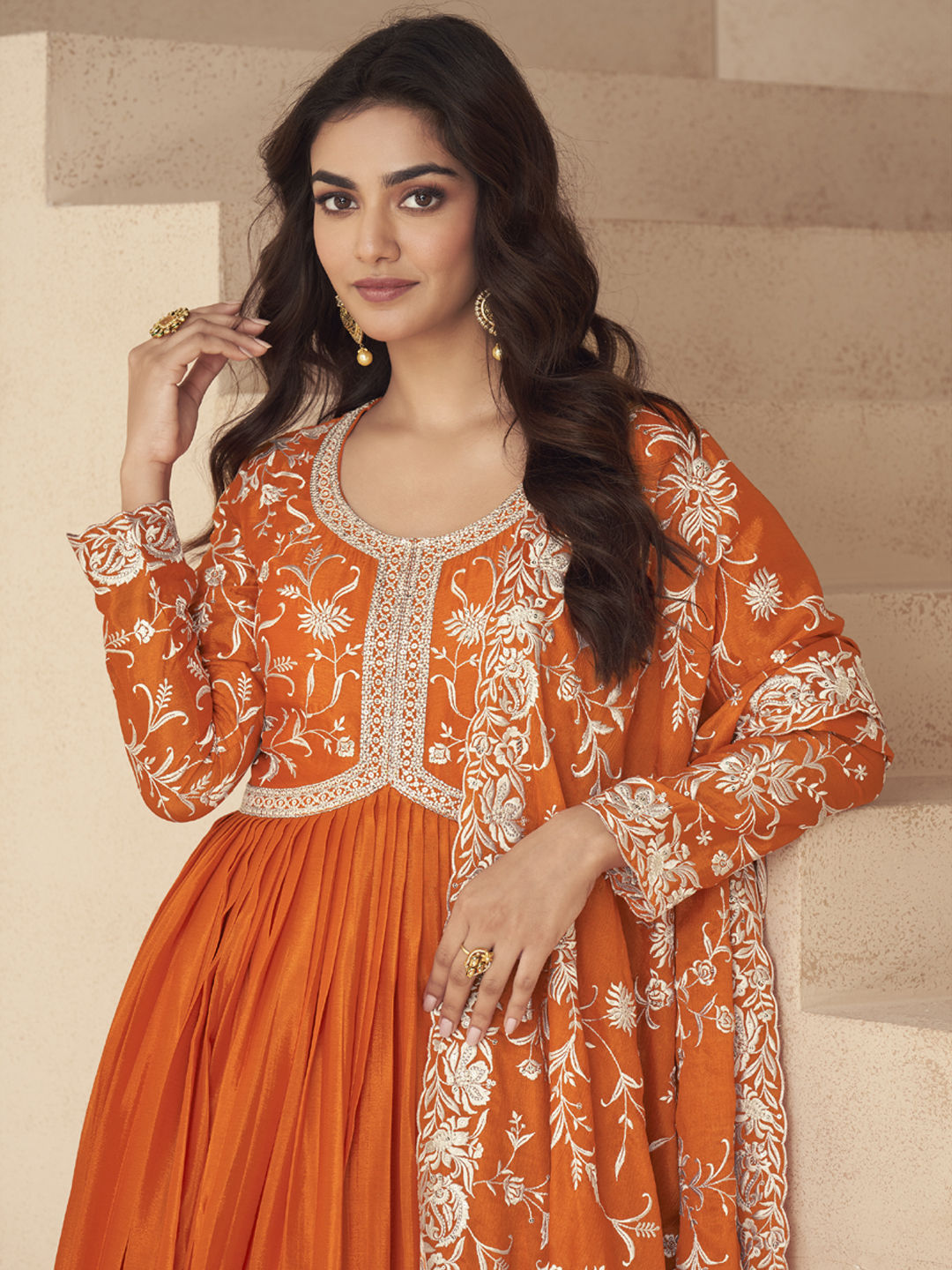 Orange color Gown in Silk fabric with Embroidered, Sequence, Thread work