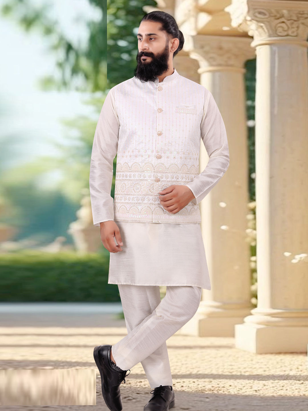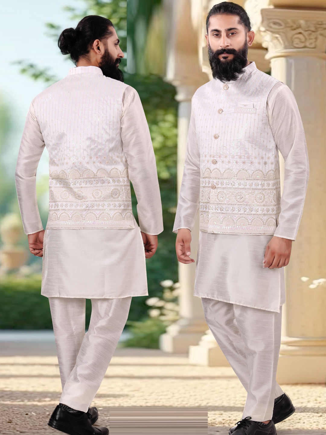 Silk Festive Kurta Pyjama with Jacket in White and Off White with Weaving work