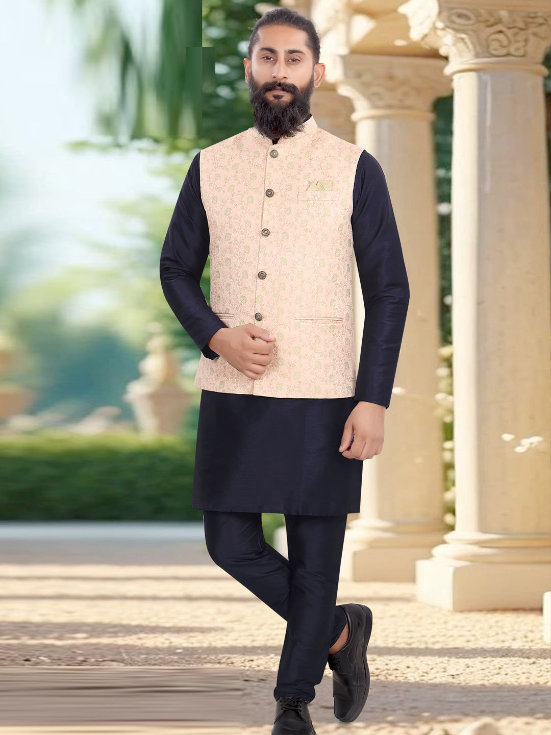 Blue color Kurta Pyjama with Jacket in Silk fabric with Weaving work