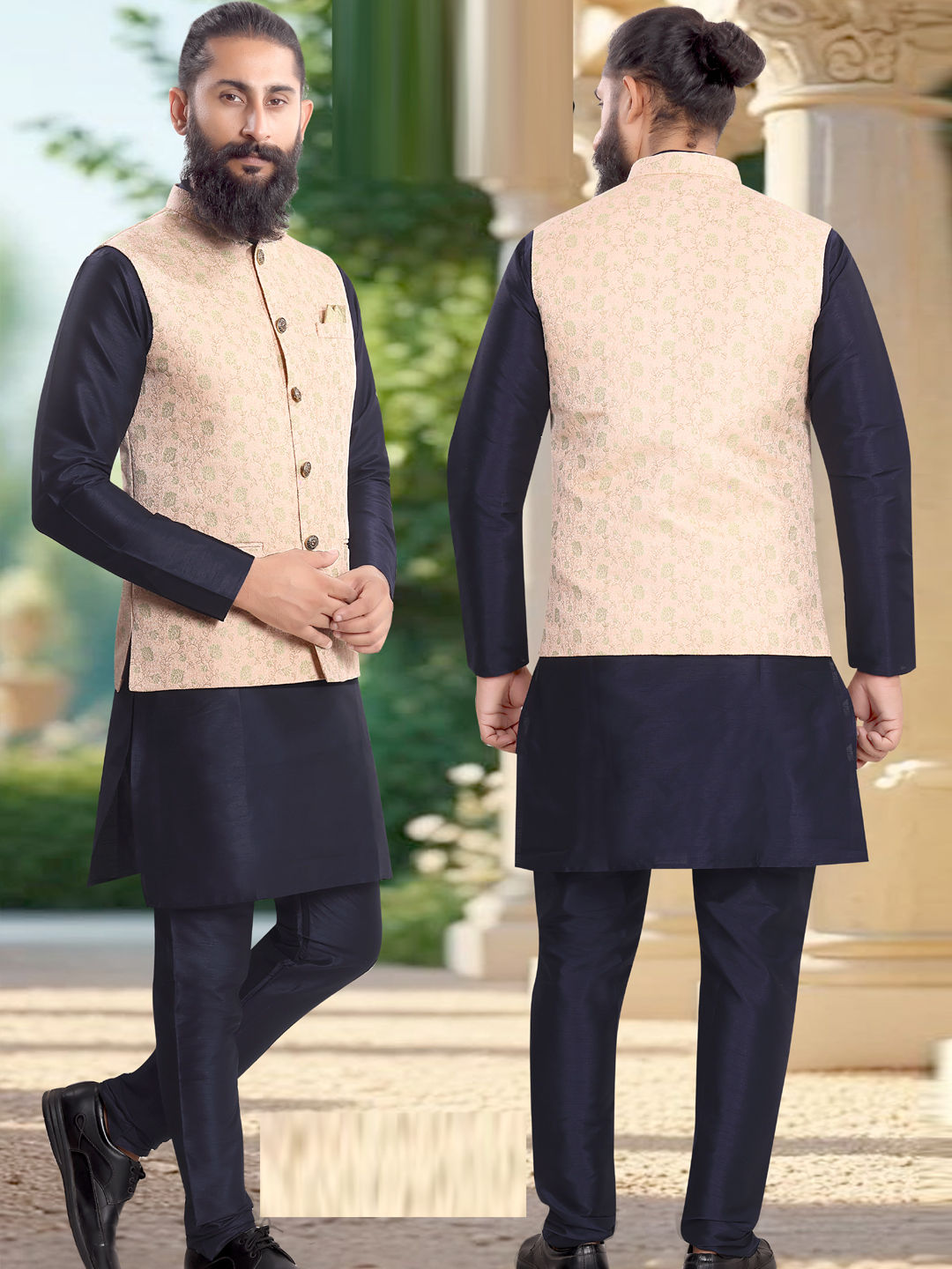 Silk Festive Kurta Pyjama with Jacket in Black and Grey with Weaving work