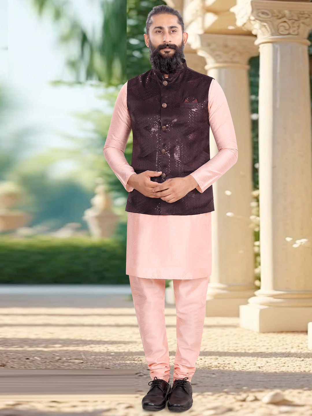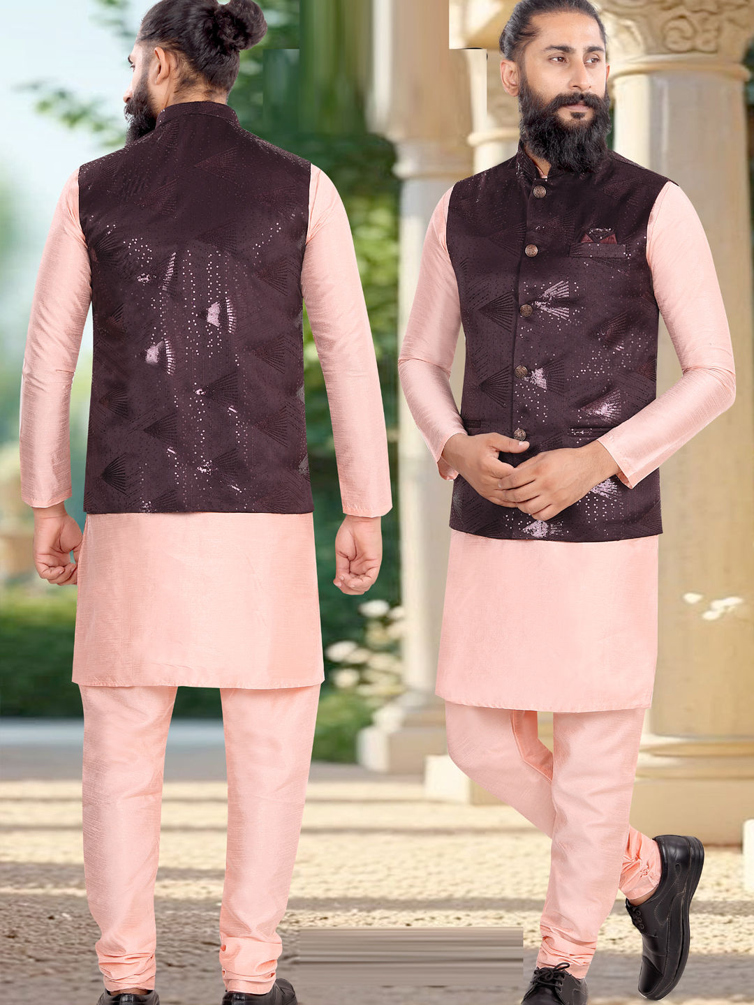Pink and Majenta color Kurta Pyjama with Jacket in Silk fabric with Weaving work