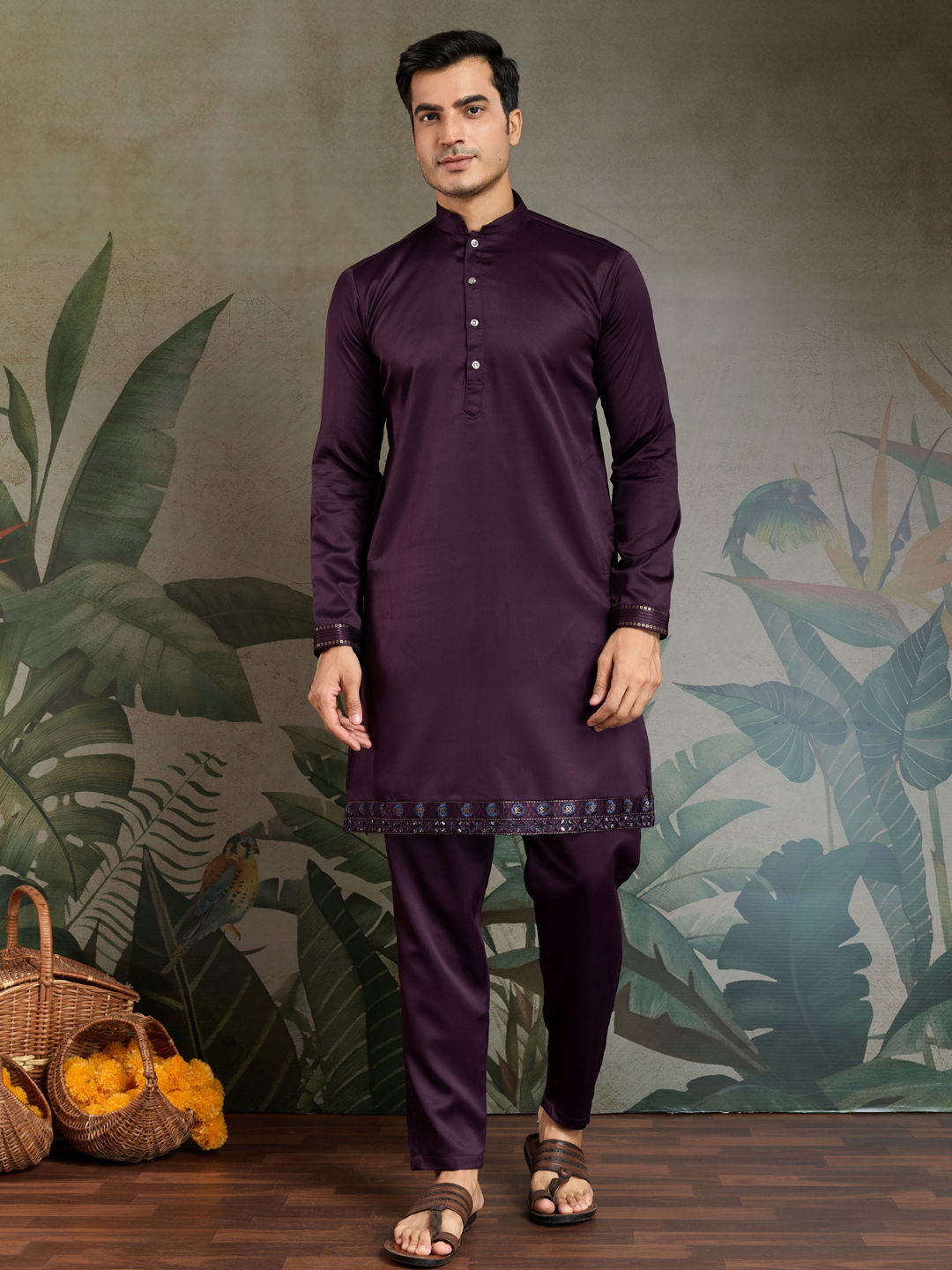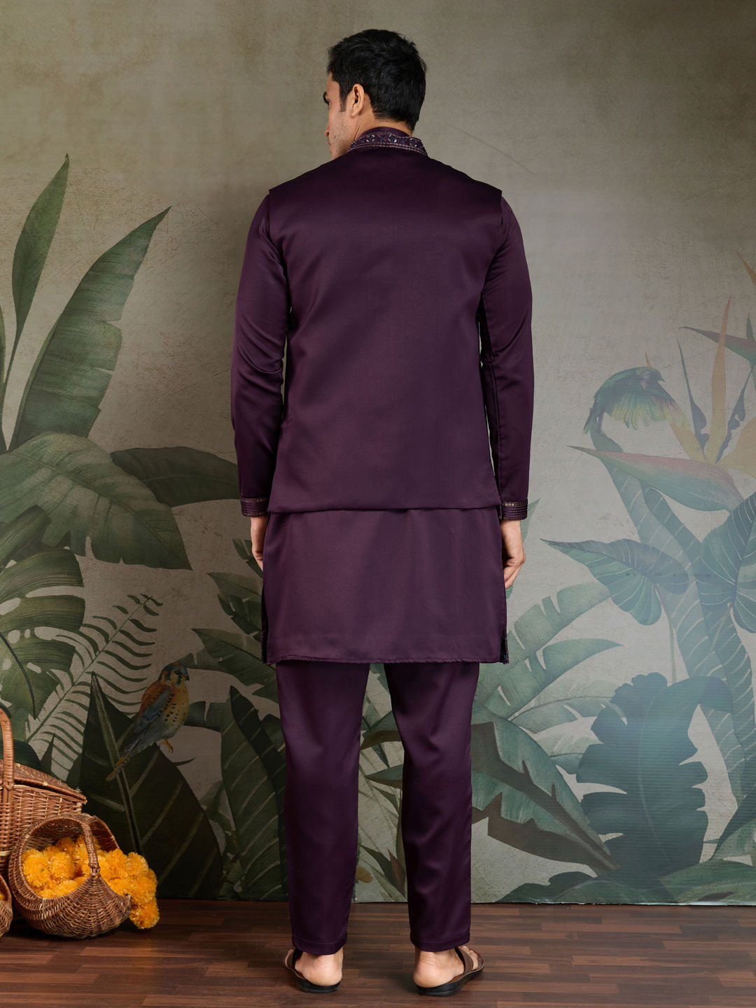 Purple and Violet color Kurta Pyjama with Jacket in Silk fabric with Embroidered, Sequence, Thread work