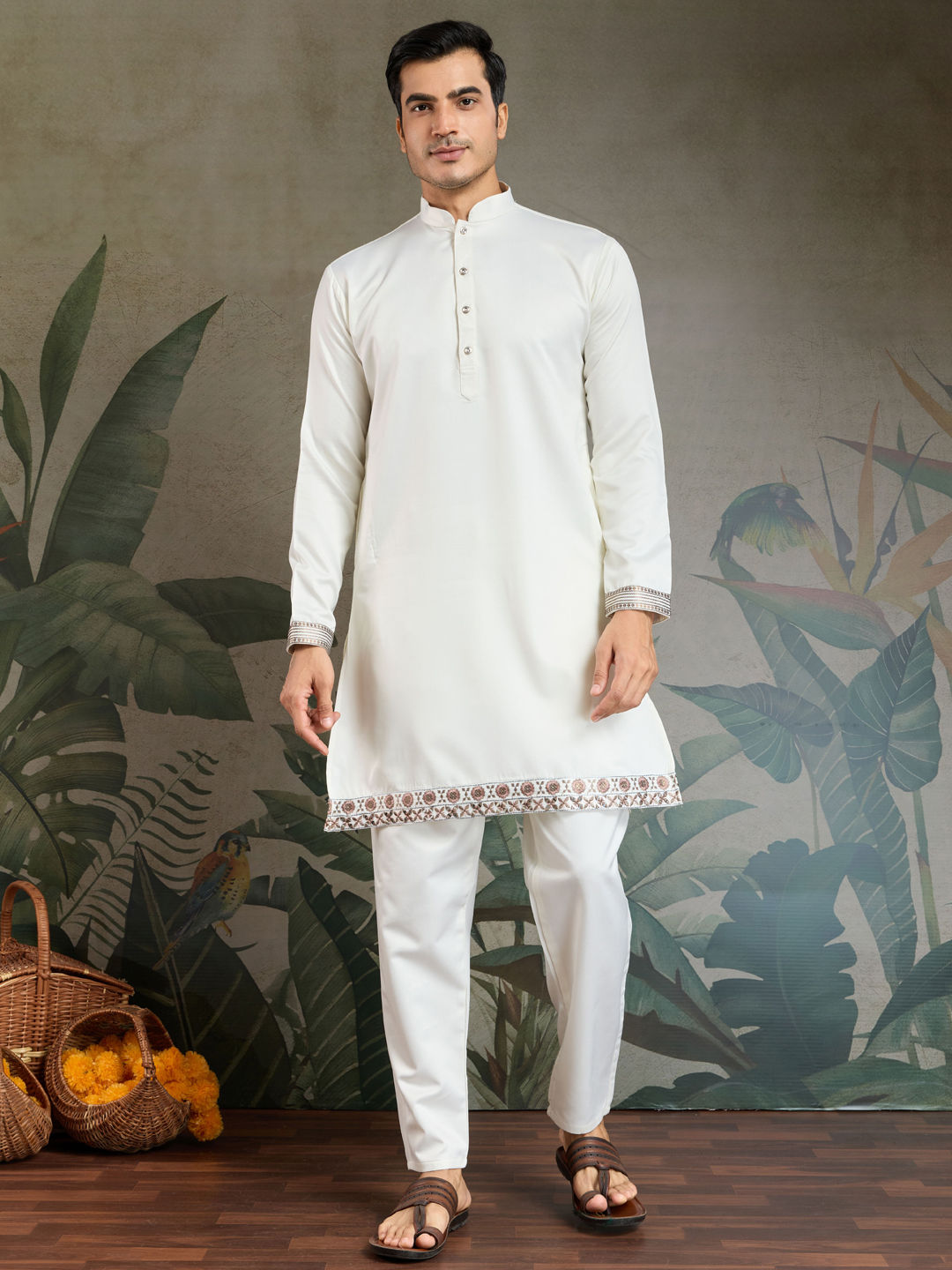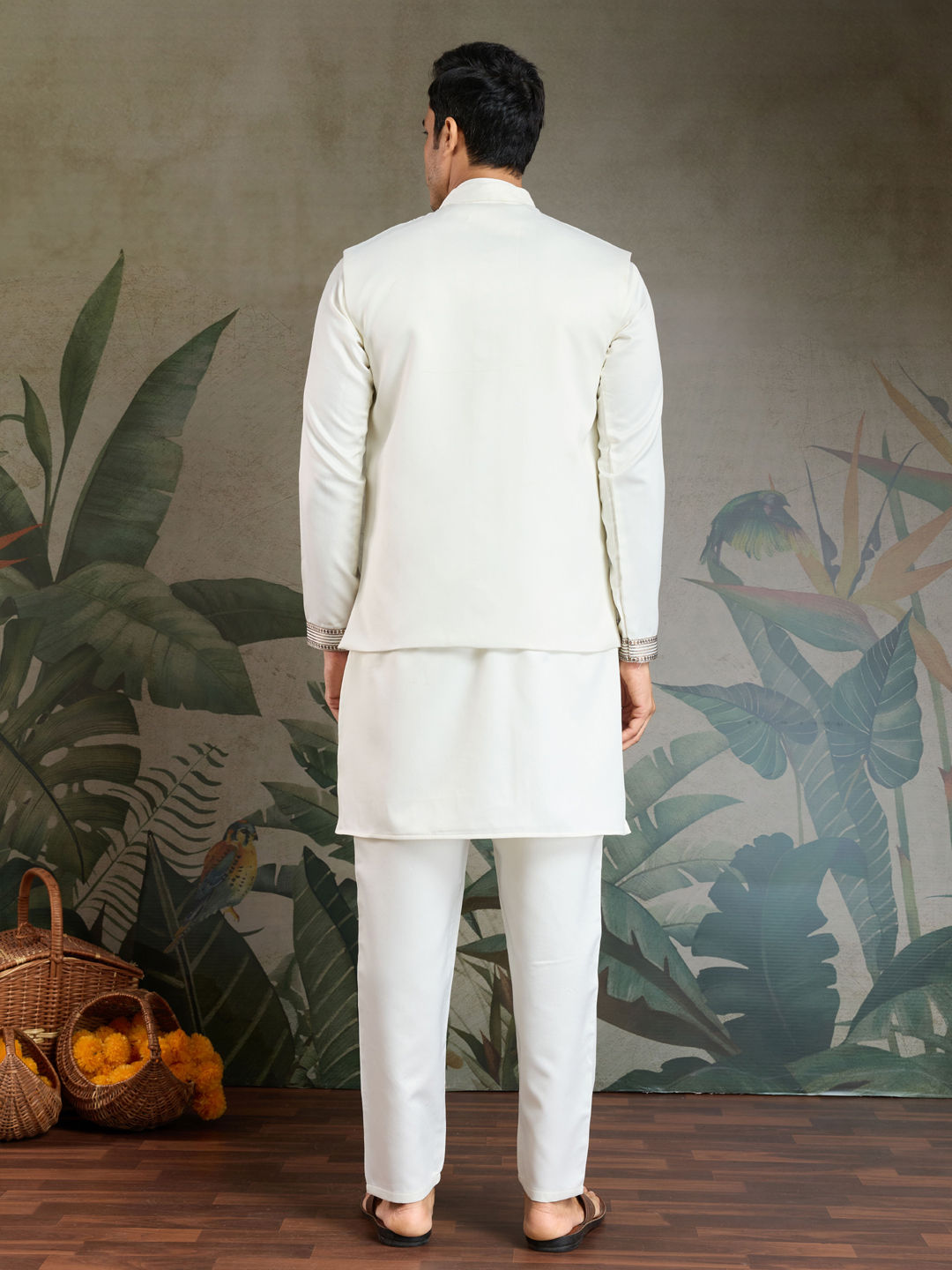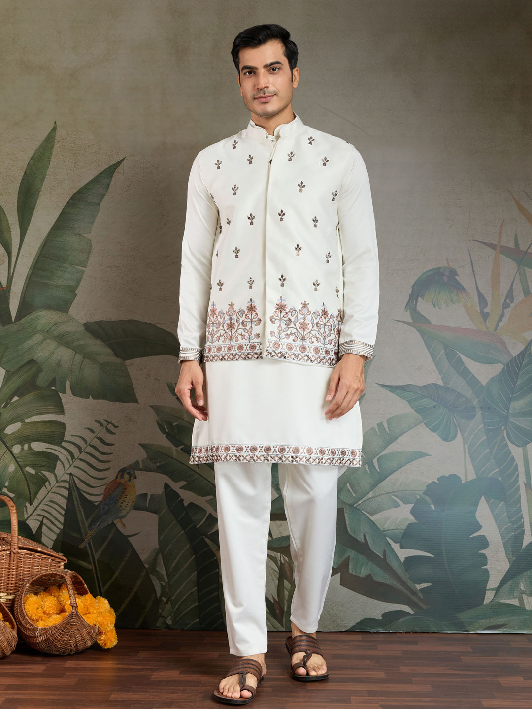 White and Off White color Kurta Pyjama with Jacket in Silk fabric with Embroidered, Sequence, Thread work