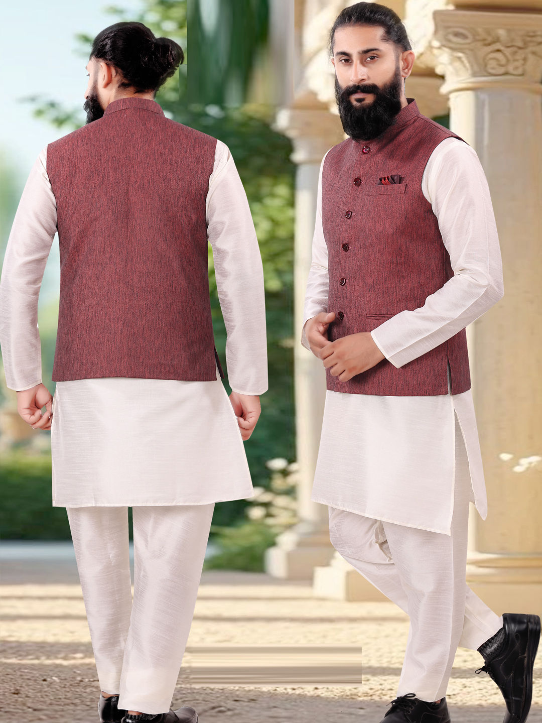 White and Off White color Kurta Pyjama with Jacket in Silk fabric with Weaving work