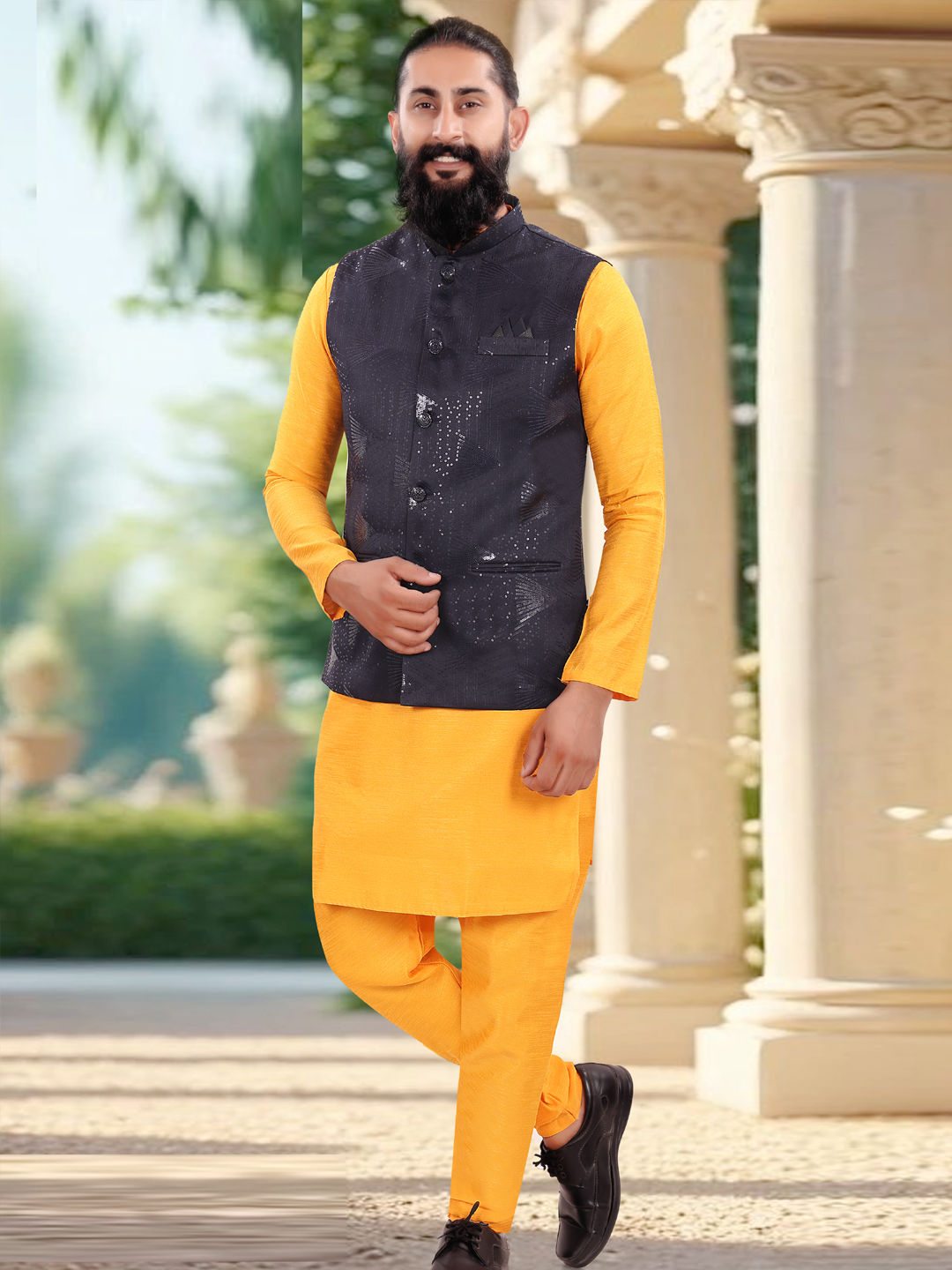 Yellow color Kurta Pyjama with Jacket in Silk fabric with Weaving work