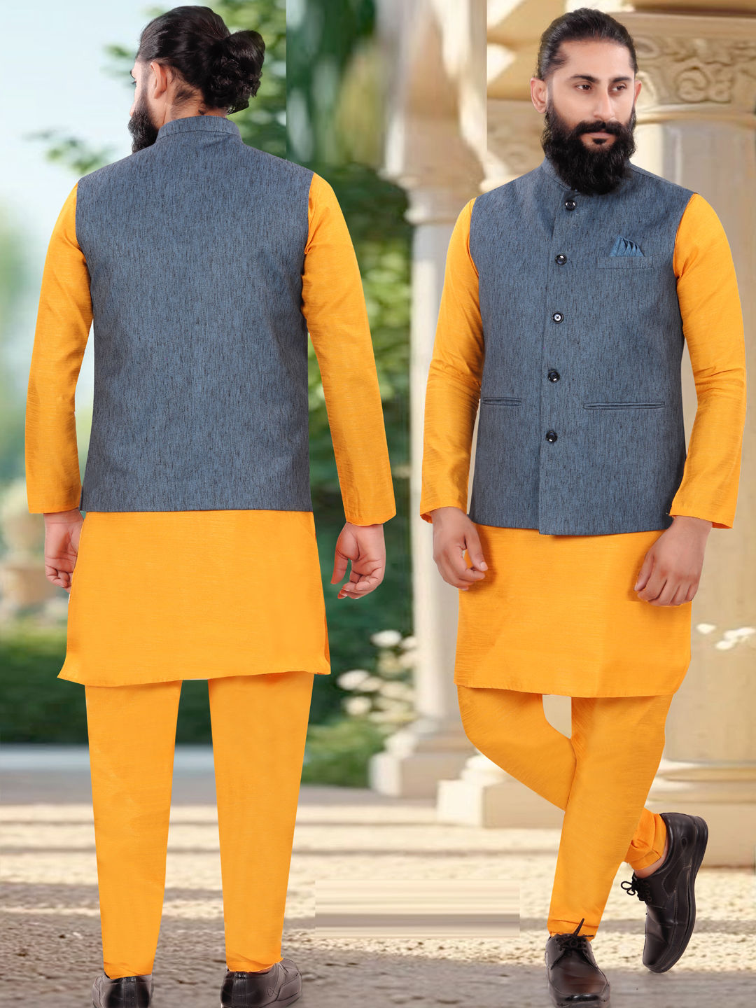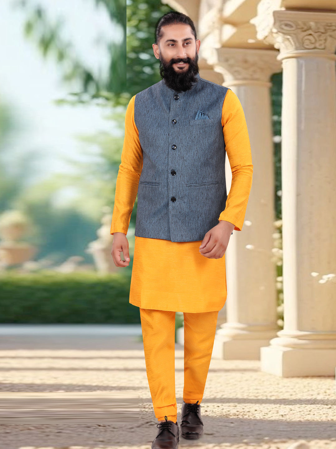 Yellow color Kurta Pyjama with Jacket in Silk fabric with Weaving work