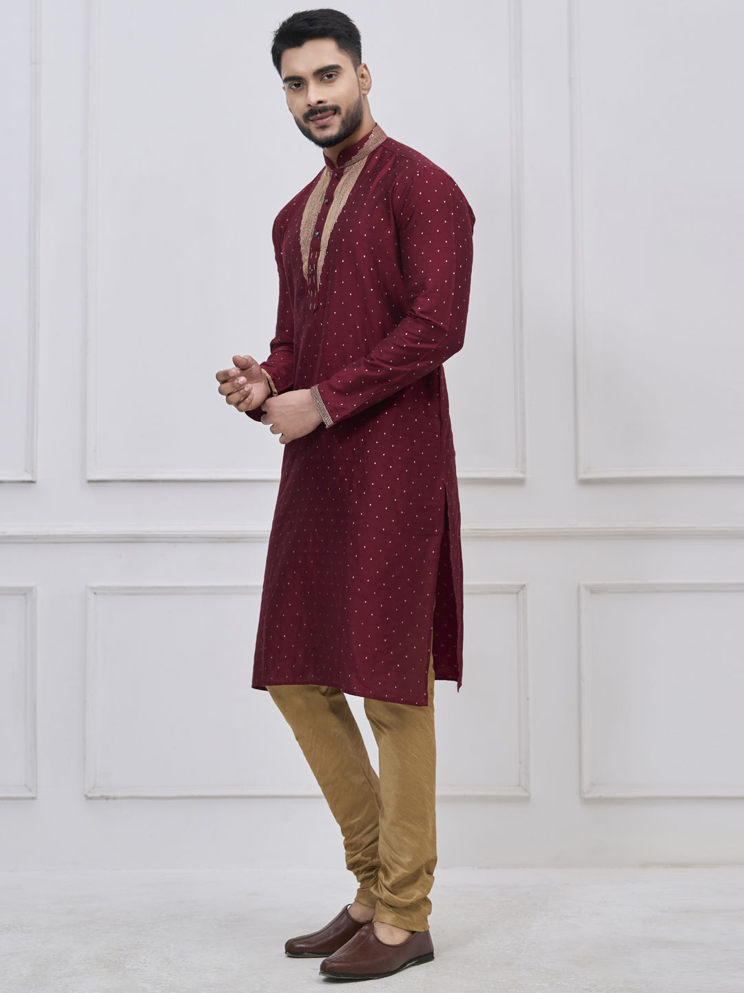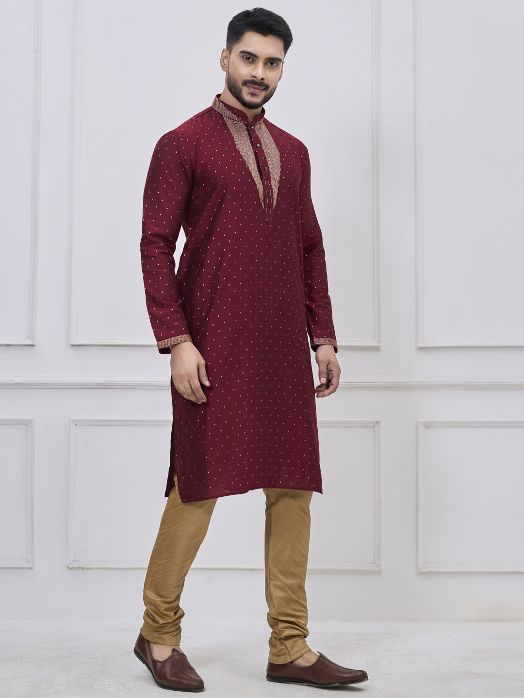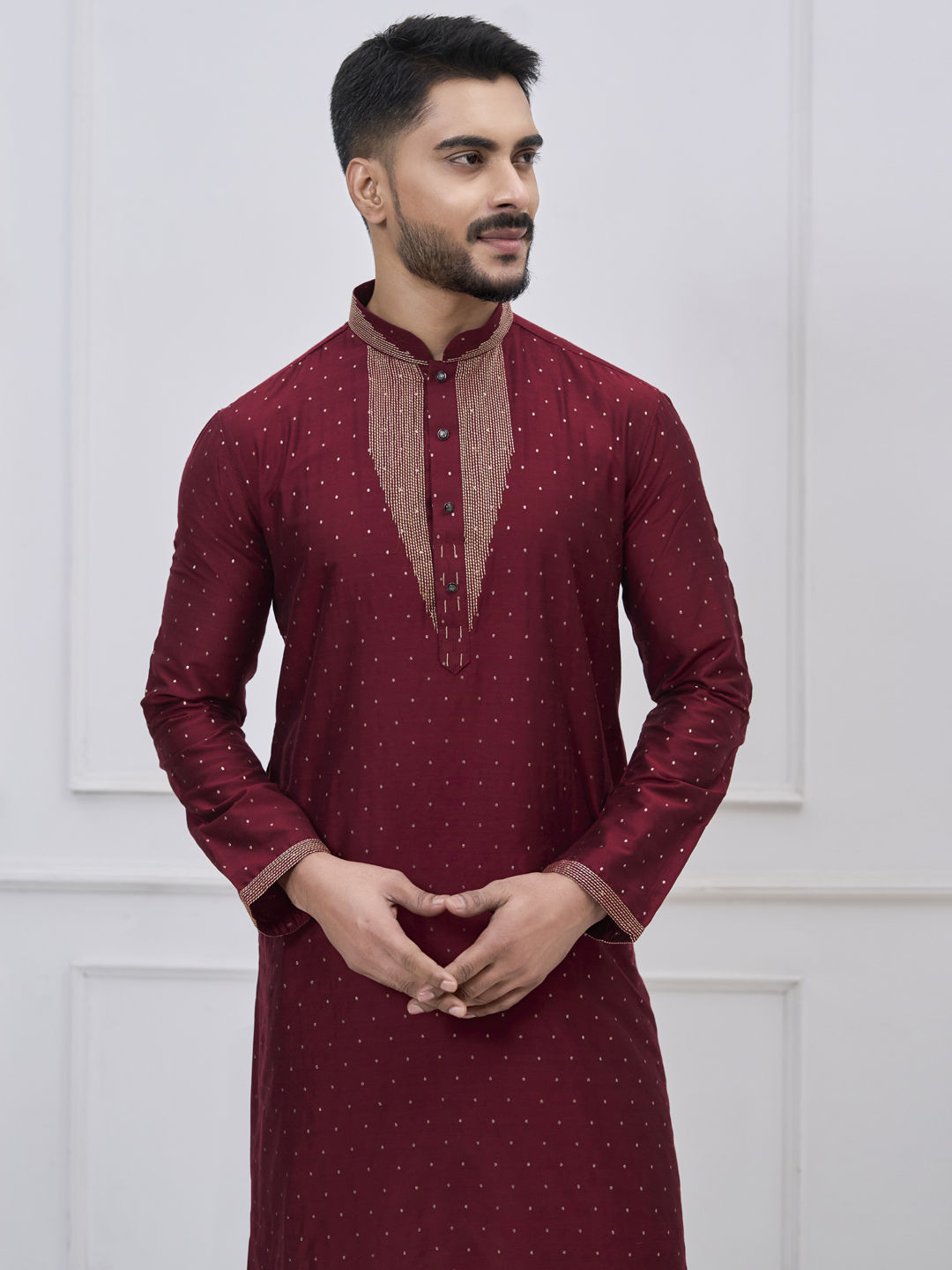 Silk Traditional Kurta Pyjamas in Red and Maroon with Thread work
