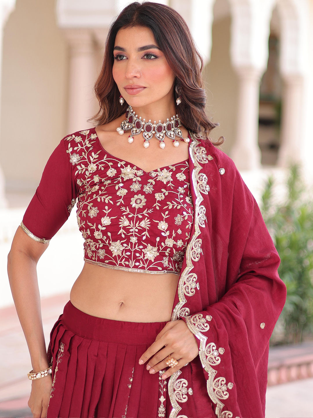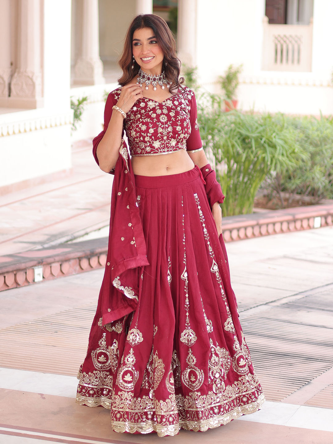 Red and Maroon color Lehenga in Silk fabric with Embroidered, Sequence, Thread work