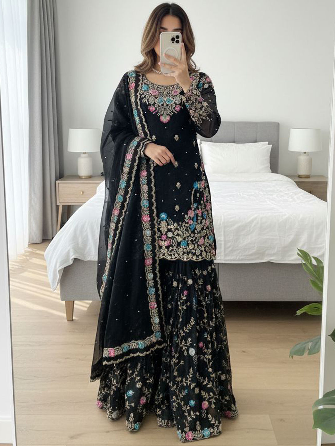 Black and Grey color Salwar Kameez in Silk fabric with Moti, Sequence, Thread work