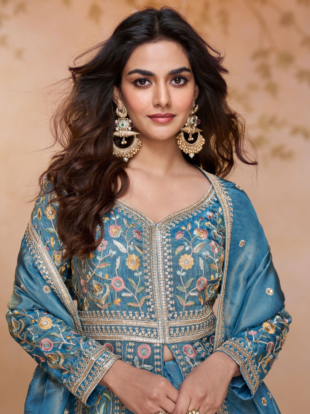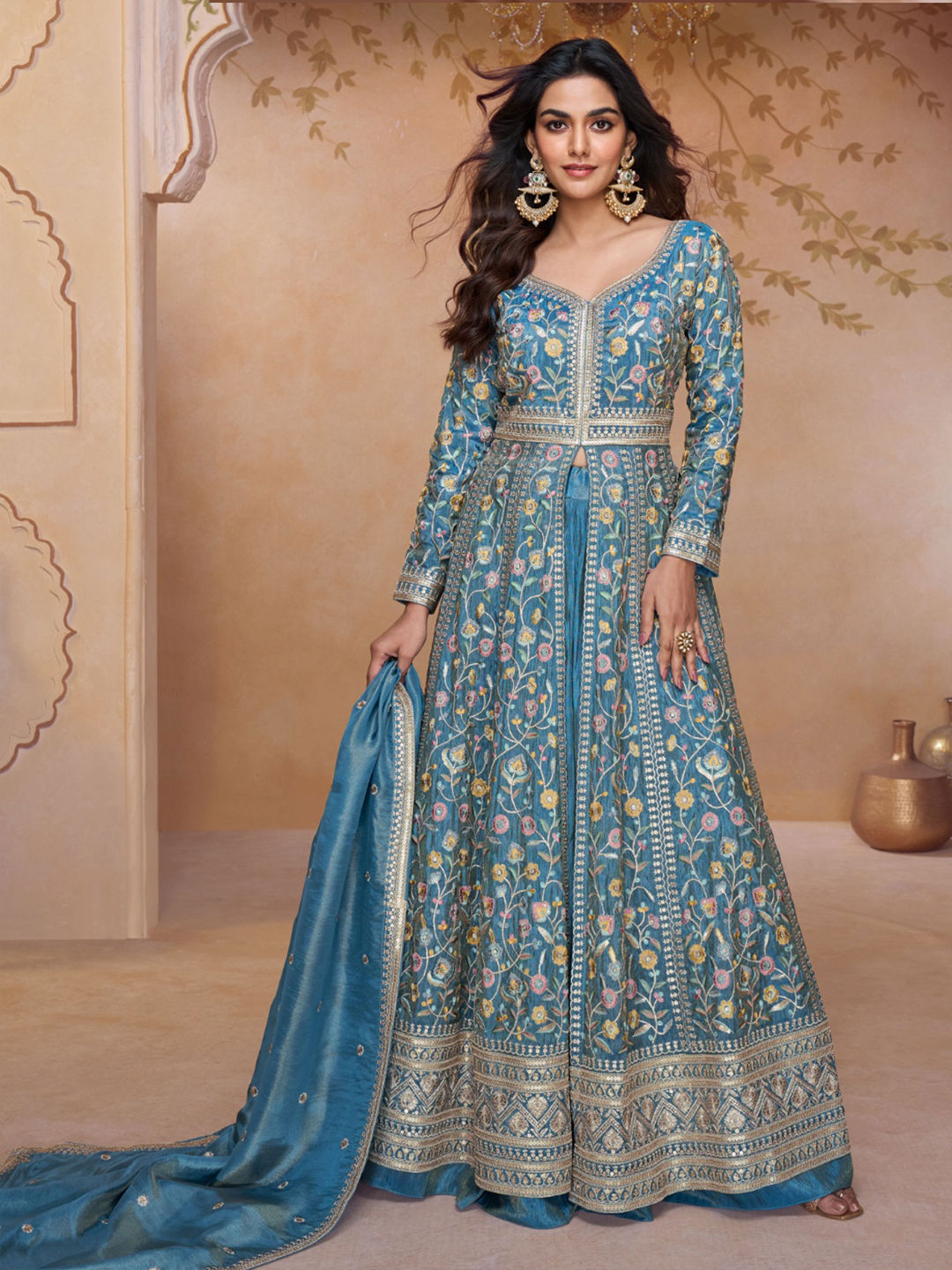 Blue color Salwar Kameez in Silk fabric with Embroidered, Mirror work