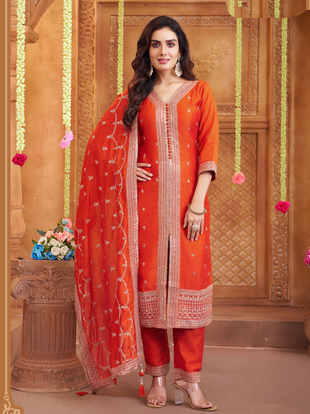 Orange color Salwar Kameez in Silk fabric with Stone, Thread work