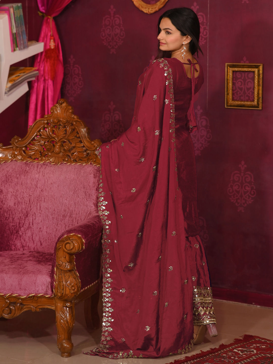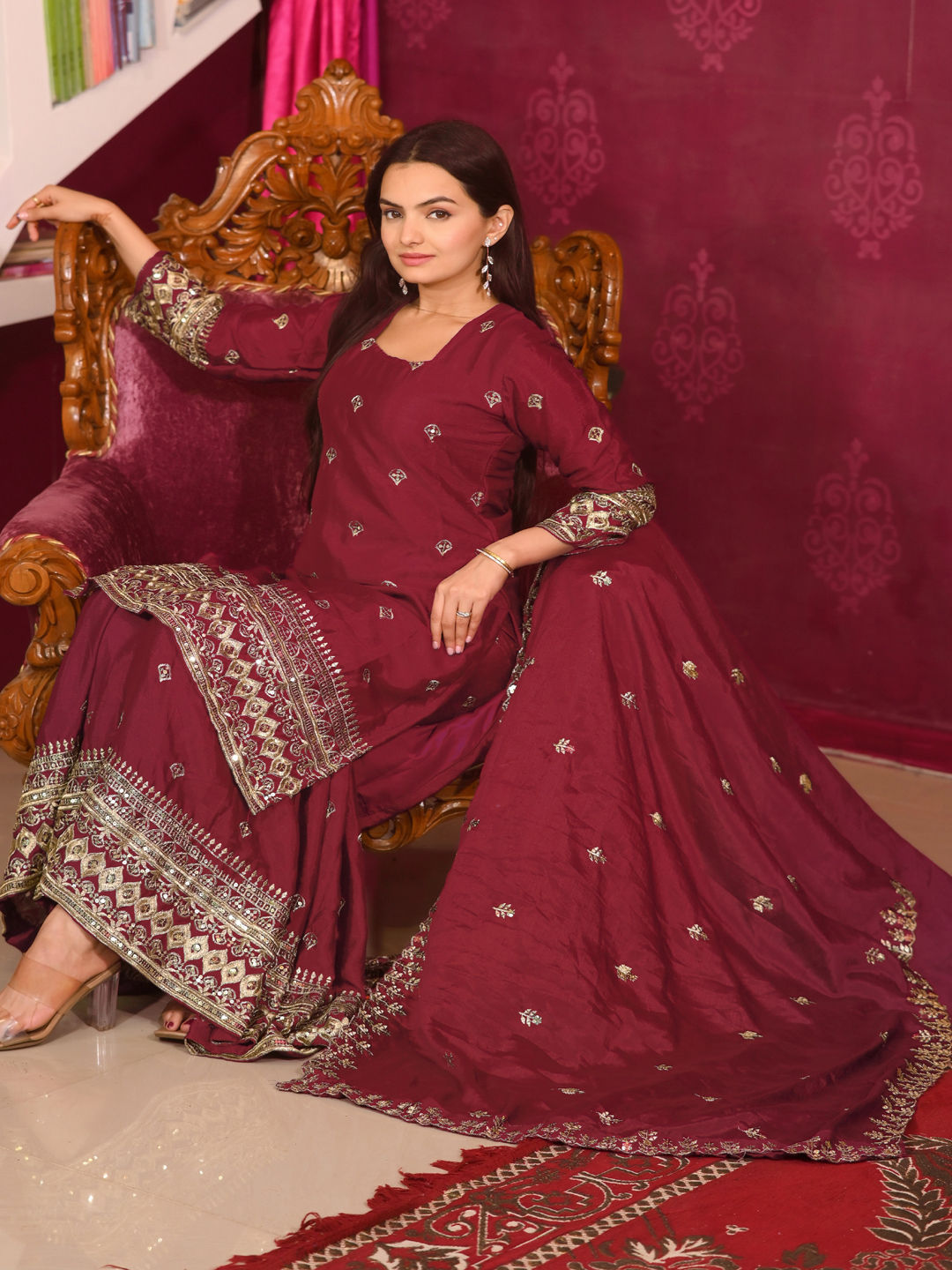 Red and Maroon color Salwar Kameez in Silk fabric with Embroidered, Sequence, Thread work