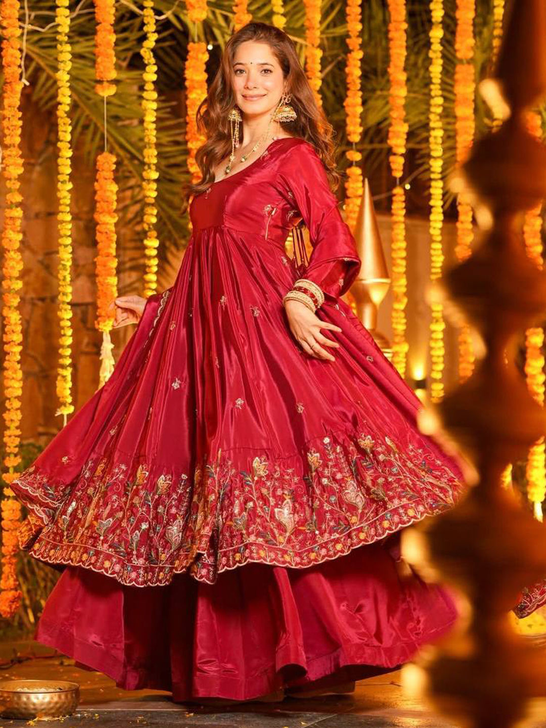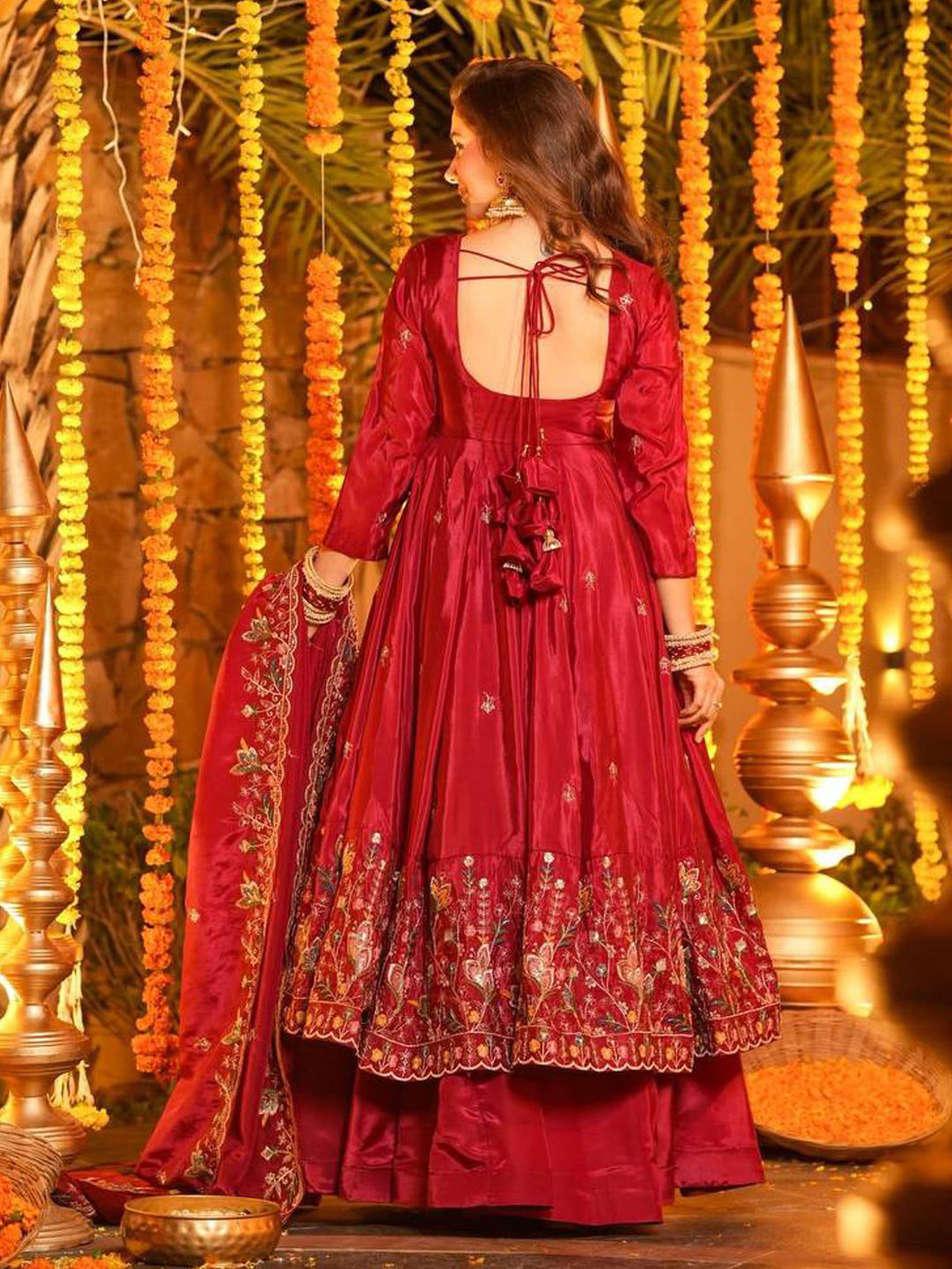 Red and Maroon color Salwar Kameez in Silk fabric with Embroidered work
