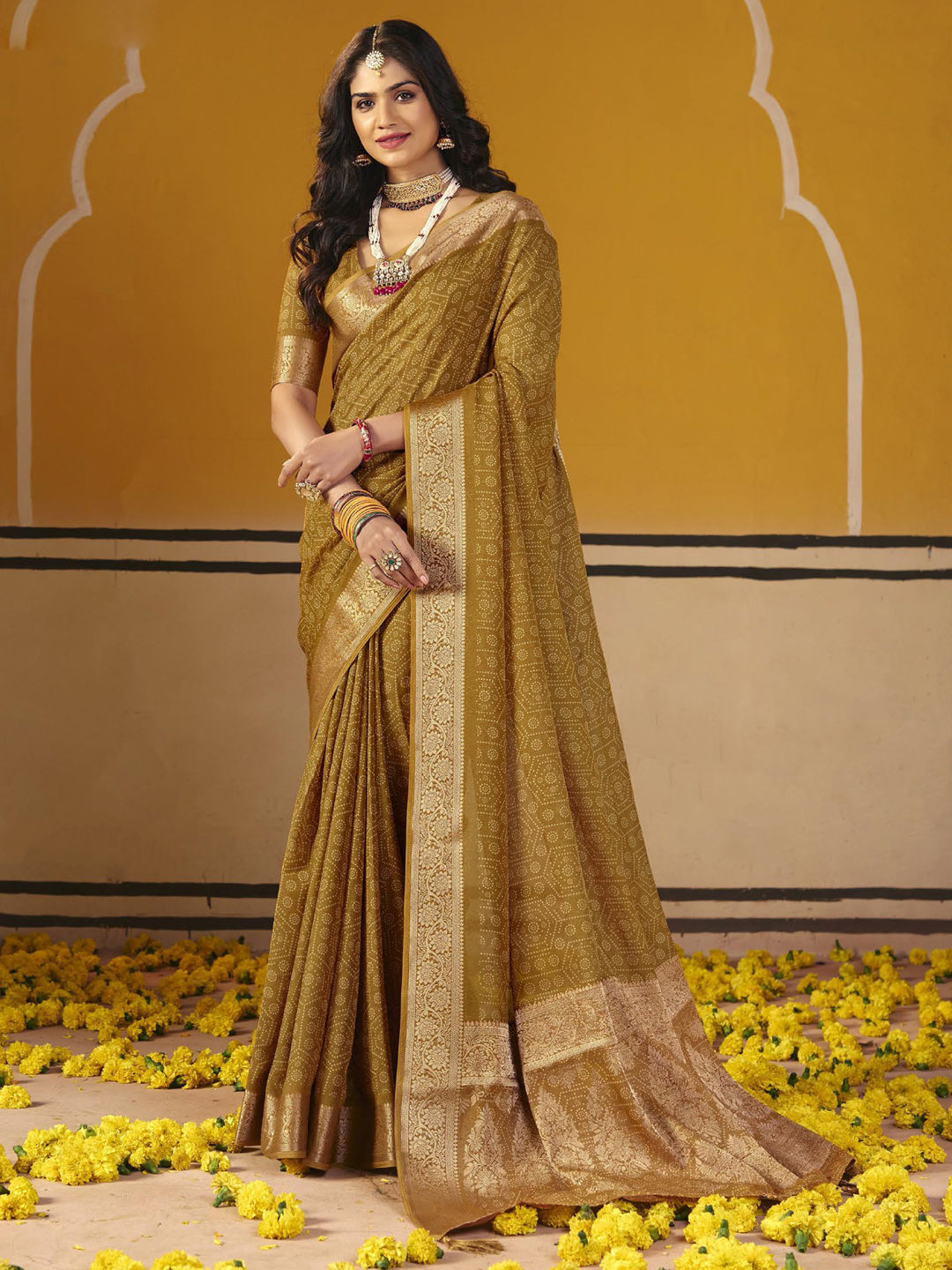 Beige and Brown color Saree in Silk fabric with Bandhej, Printed, Weaving work
