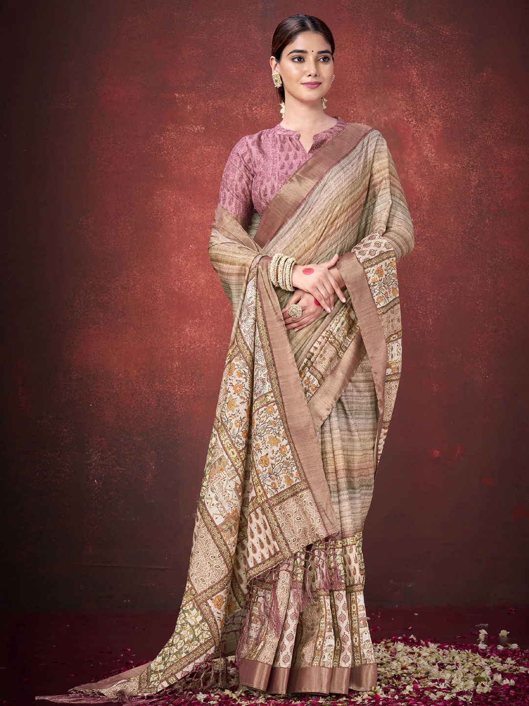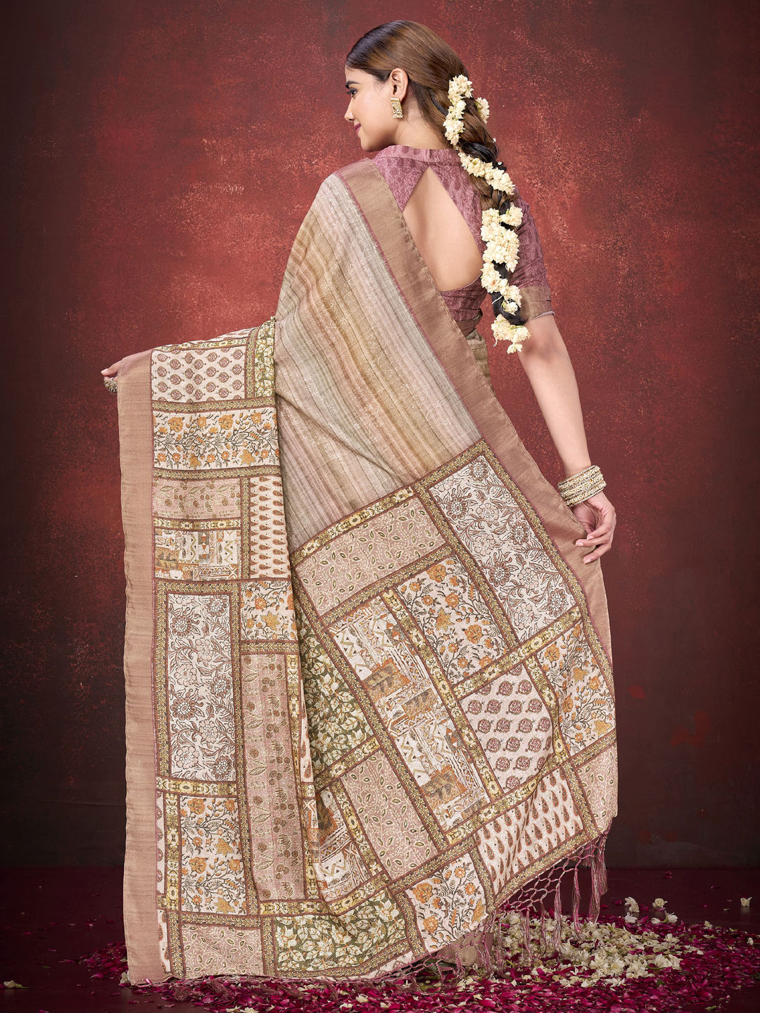 Beige and Brown color Saree in Silk fabric with Printed work
