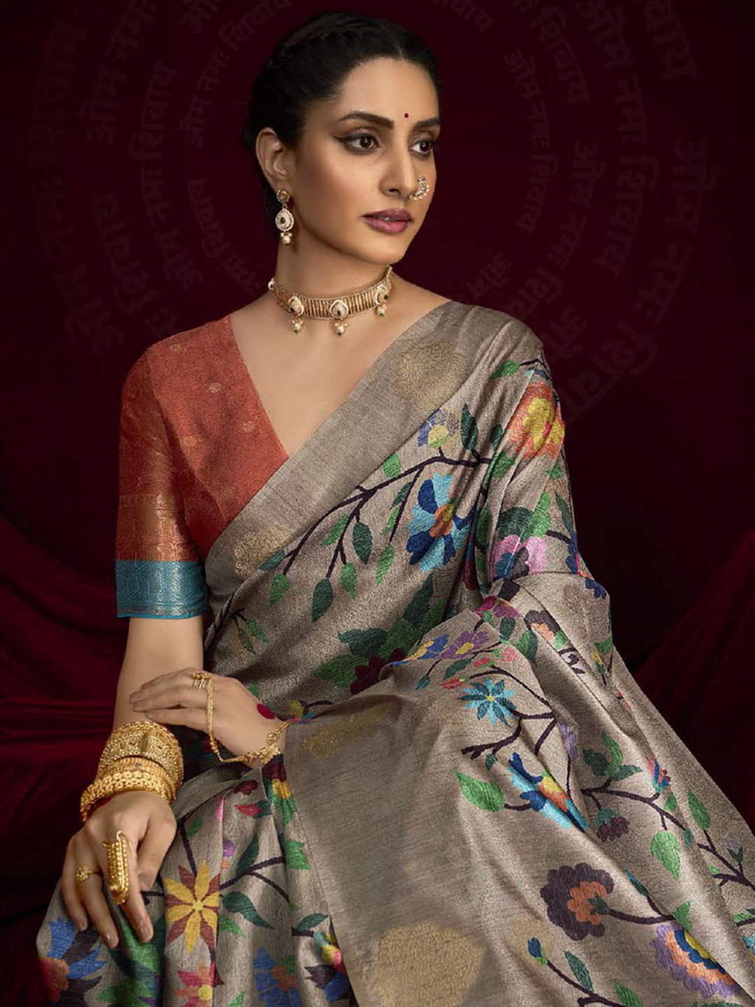 Beige and Brown, Black and Grey color Saree in Silk fabric with Weaving work