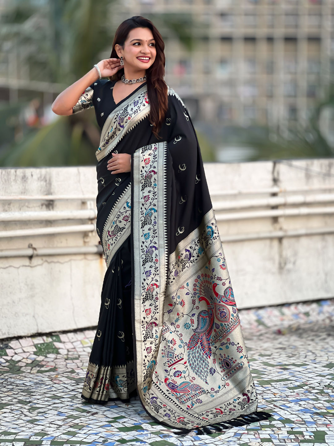 Black and Grey color Saree in Silk fabric with Weaving work