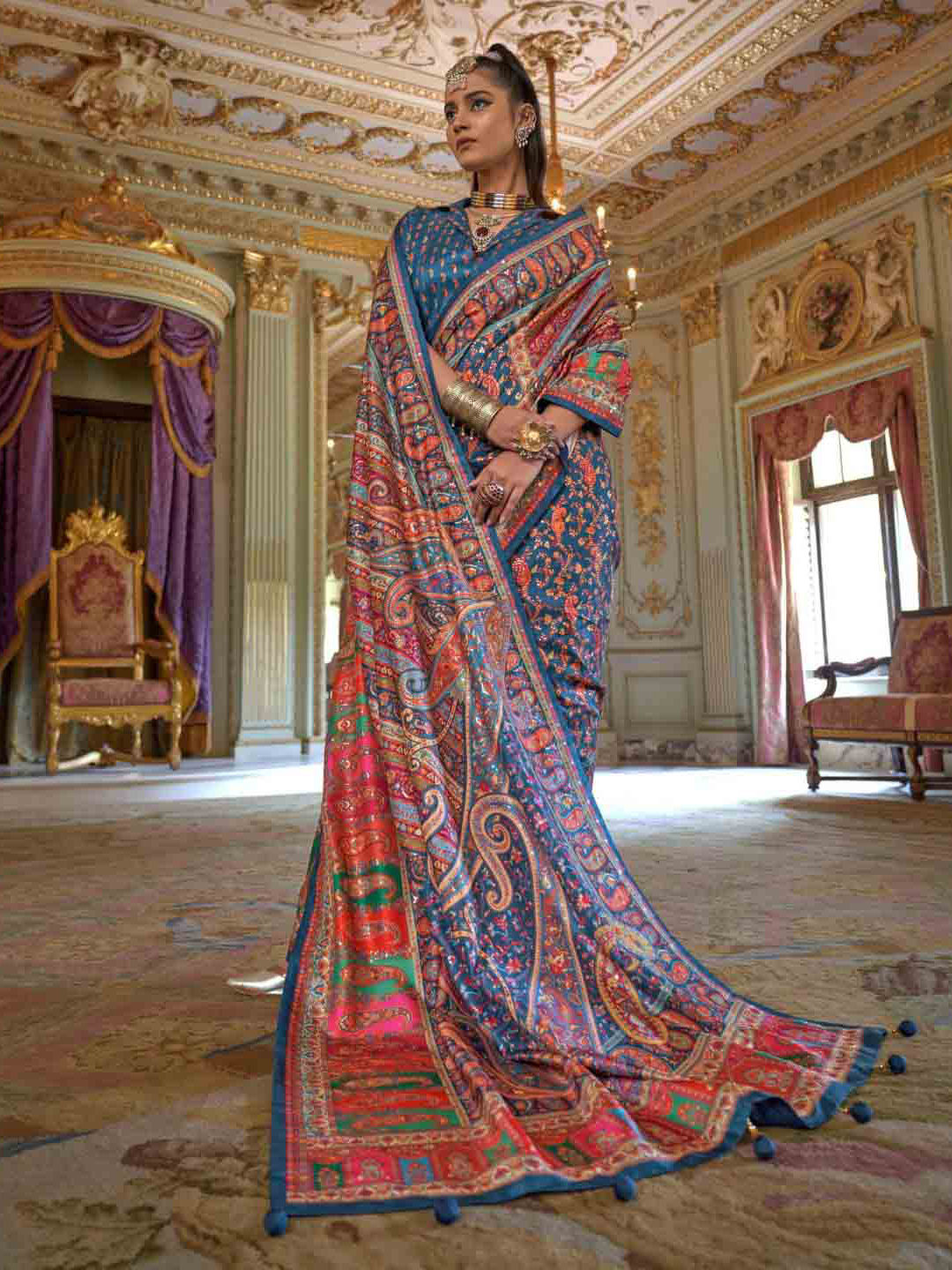 Silk Wedding Saree in Blue with Printed work