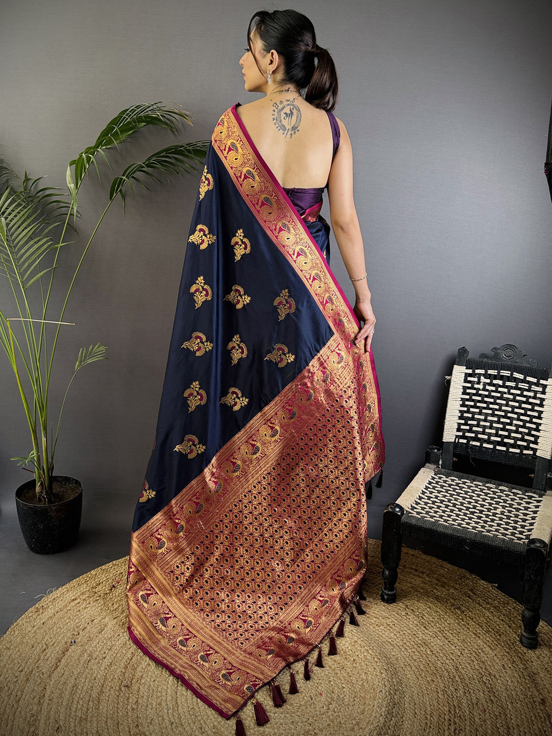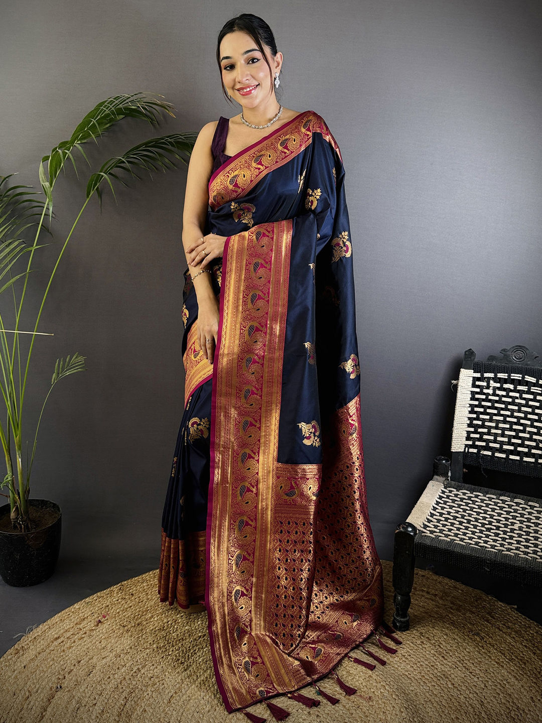 Silk Traditional Saree in Black and Grey with Weaving work