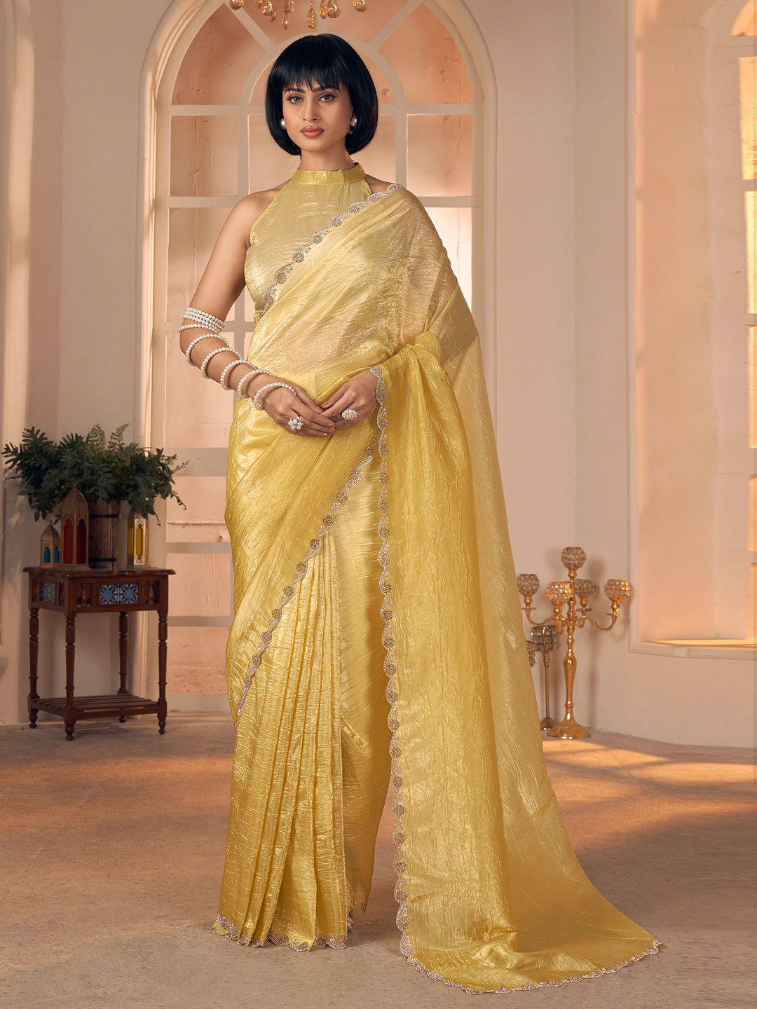 Gold color Saree in Silk fabric with Zircon work