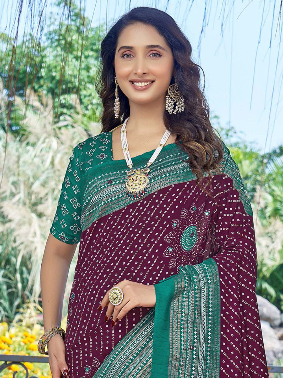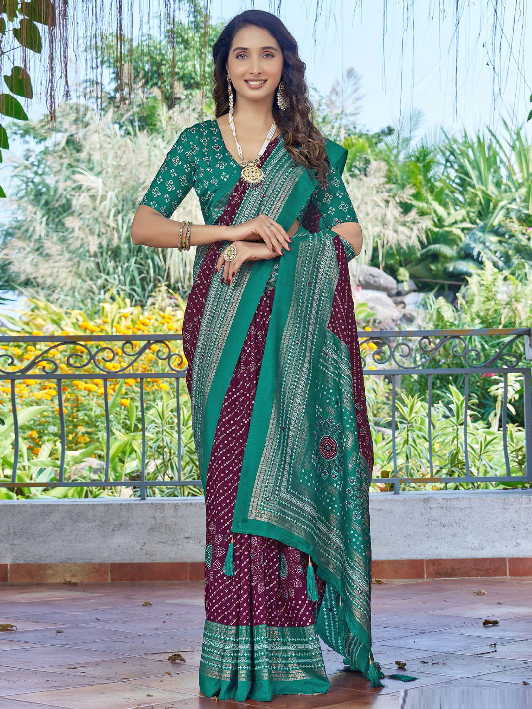 Green, Purple and Violet color Saree in Silk fabric with Bandhej, Printed work