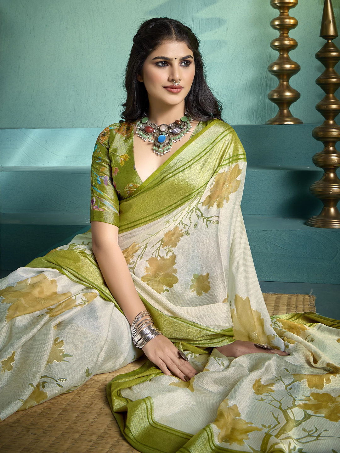 Green, White and Off White color Saree in Silk fabric with Floral, Printed, Weaving work