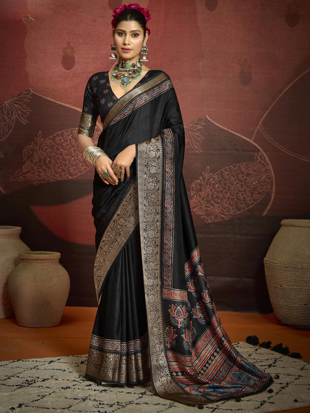 Silk Festive Saree in Black and Grey with Printed work