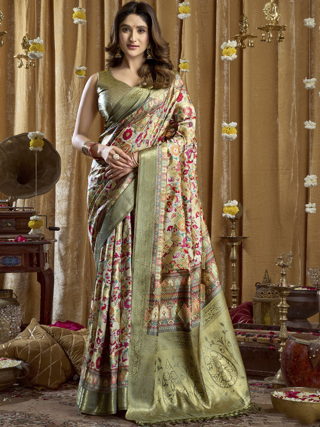 Green color Saree in Silk fabric with Printed, Weaving work