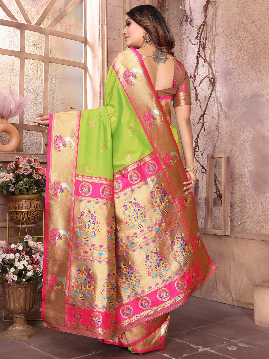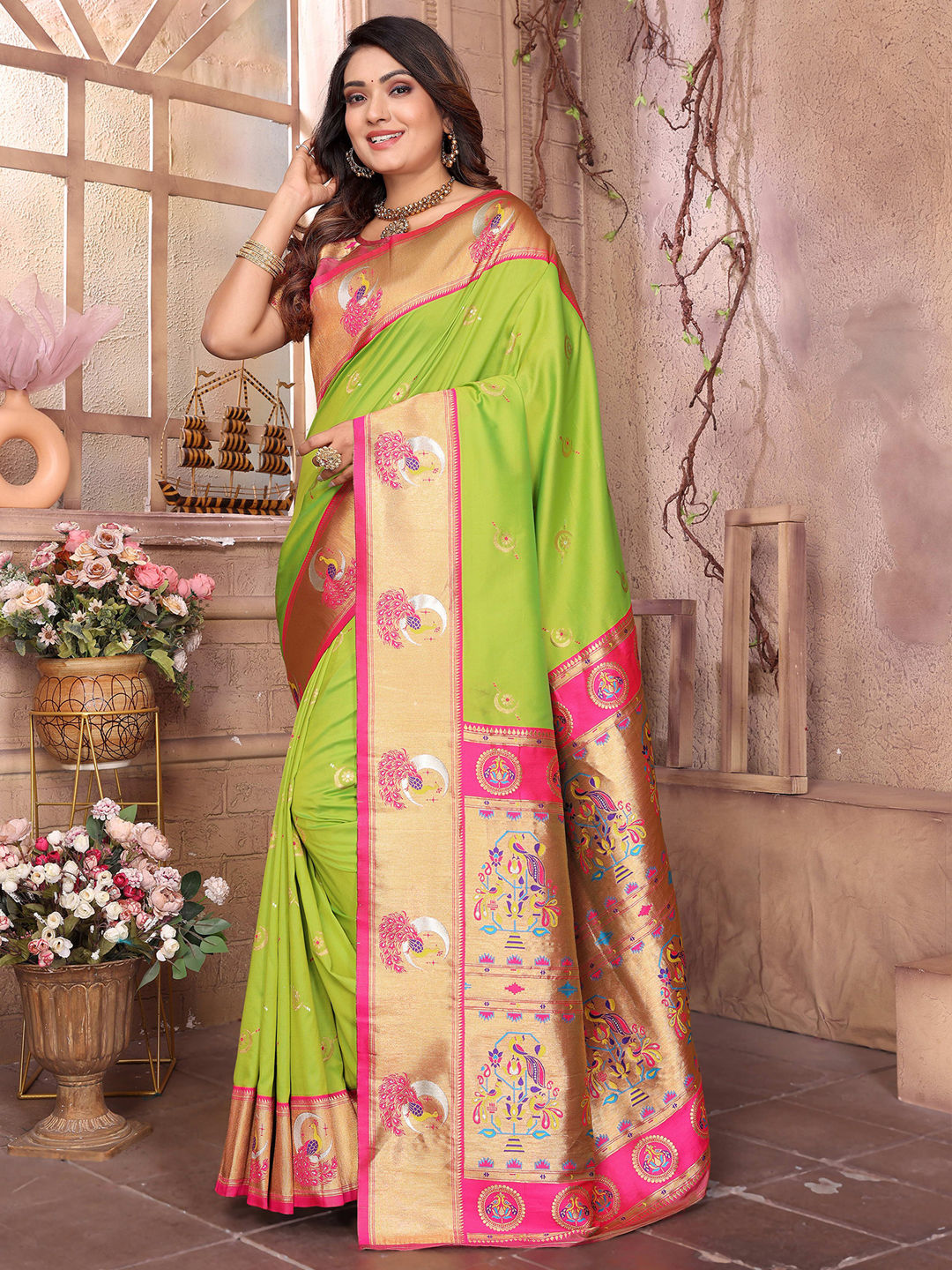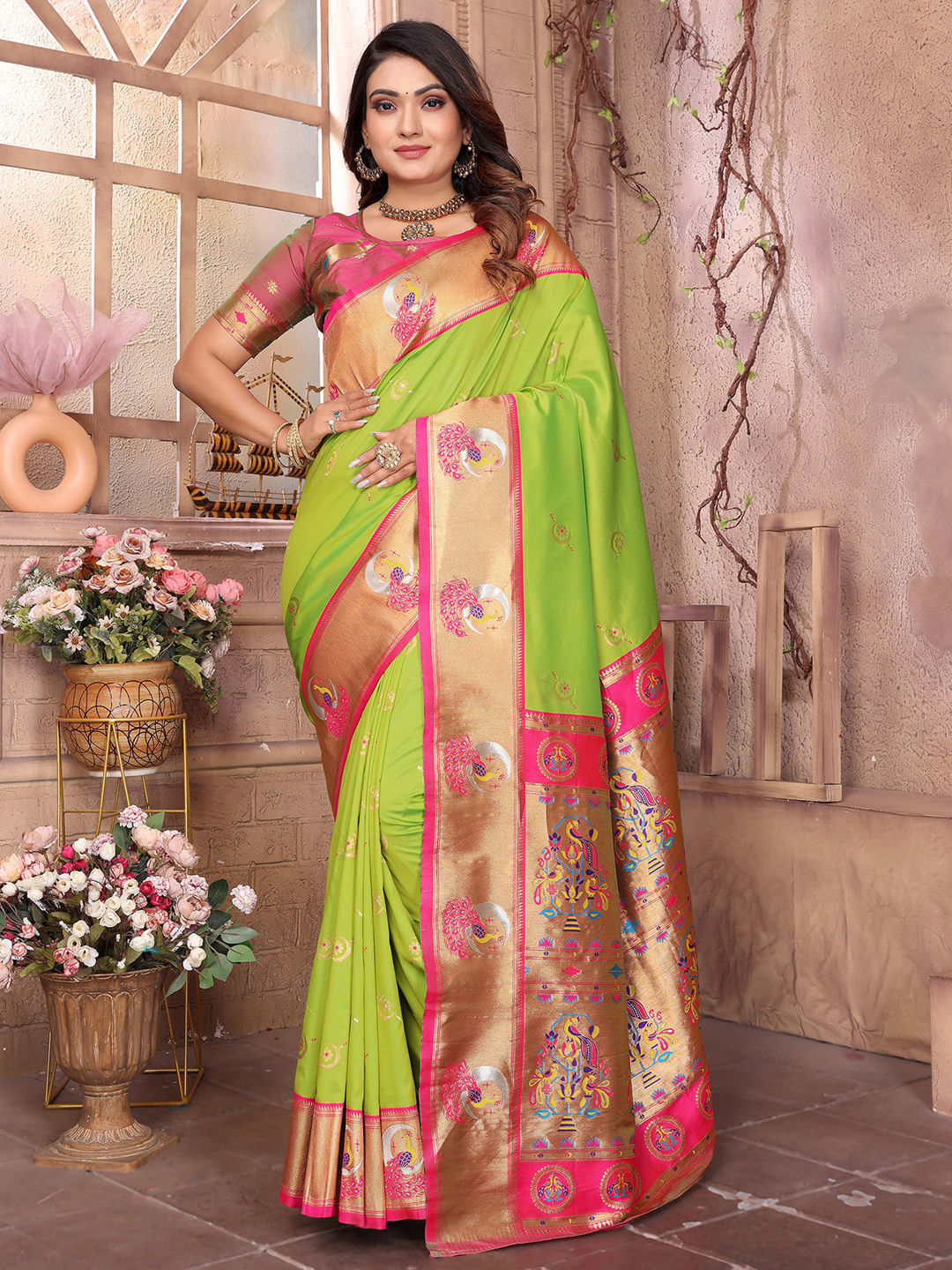 Green color Saree in Silk fabric with Weaving work