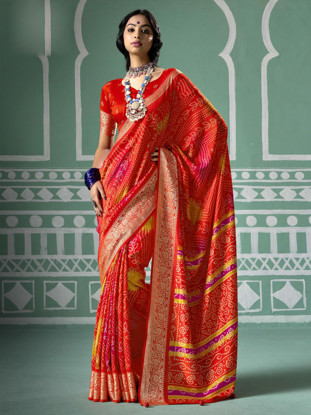 Silk Festive Saree in Red and Maroon with Bandhej work