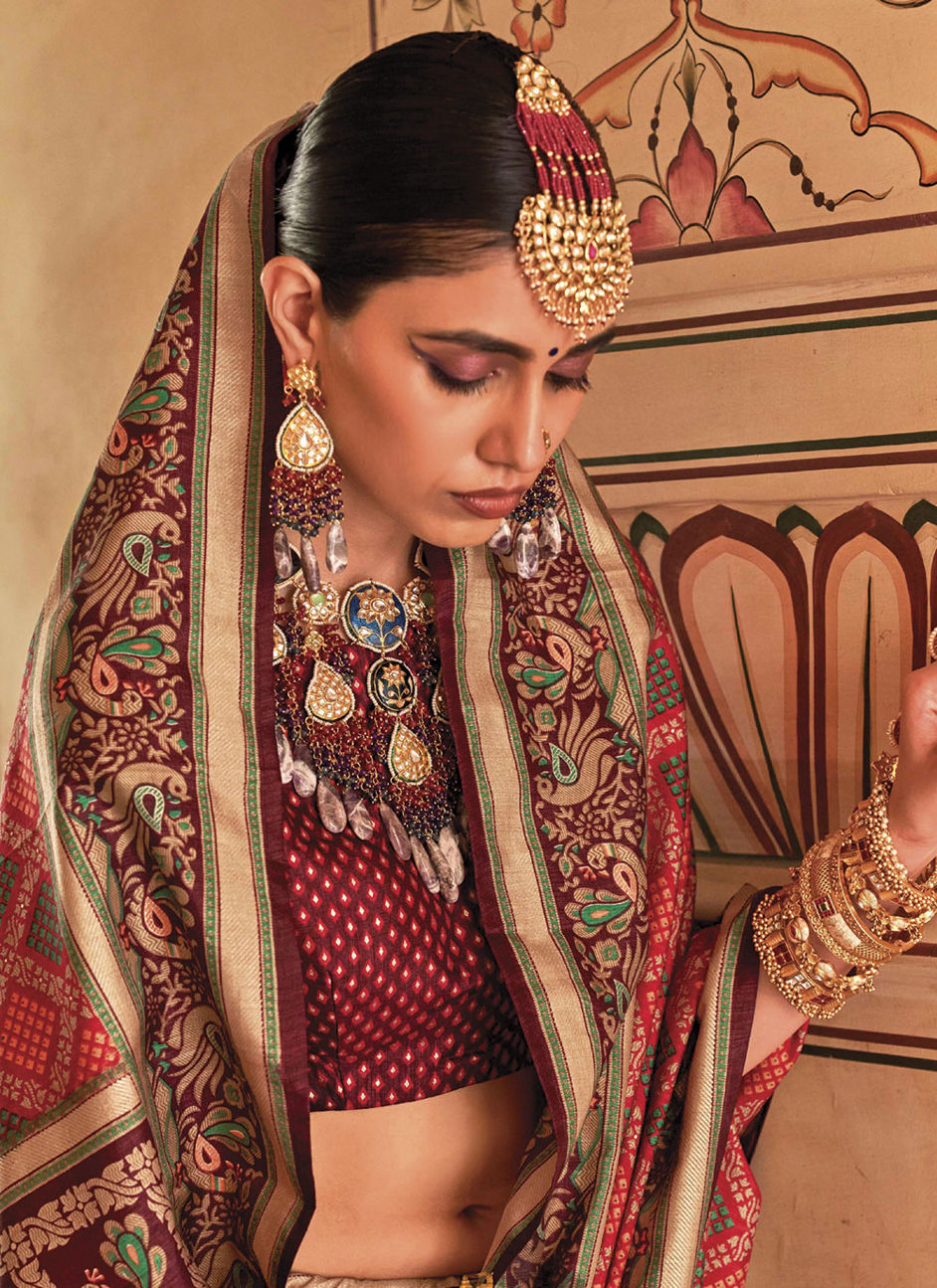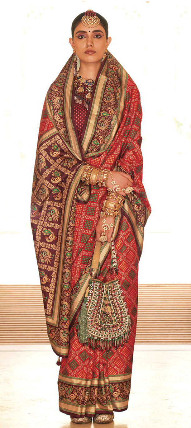 Red and Maroon color Saree in Silk fabric with Printed work
