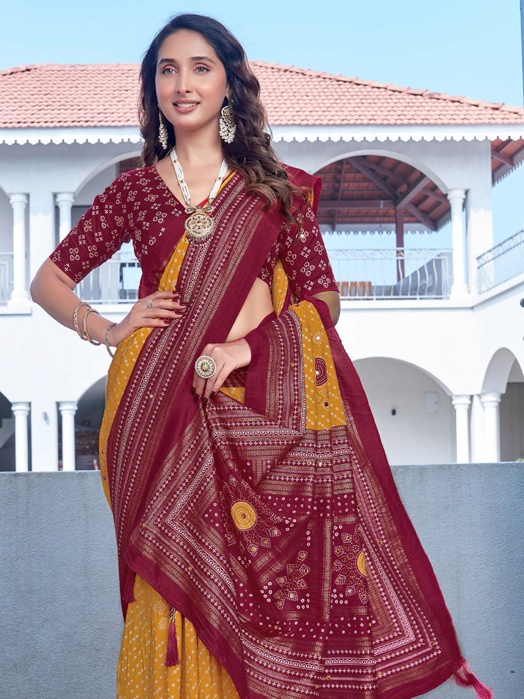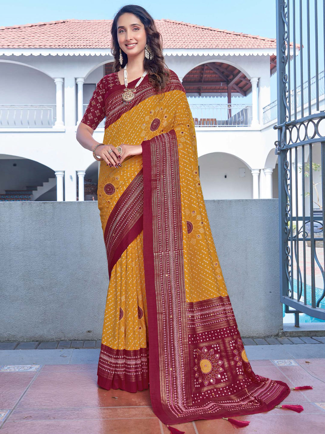 Yellow color Saree in Silk fabric with Bandhej, Printed work