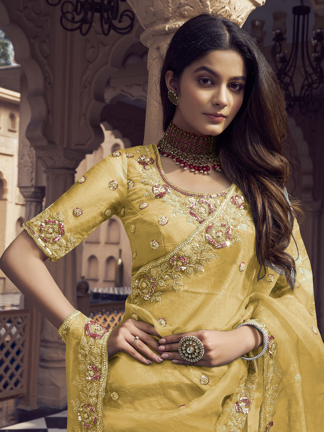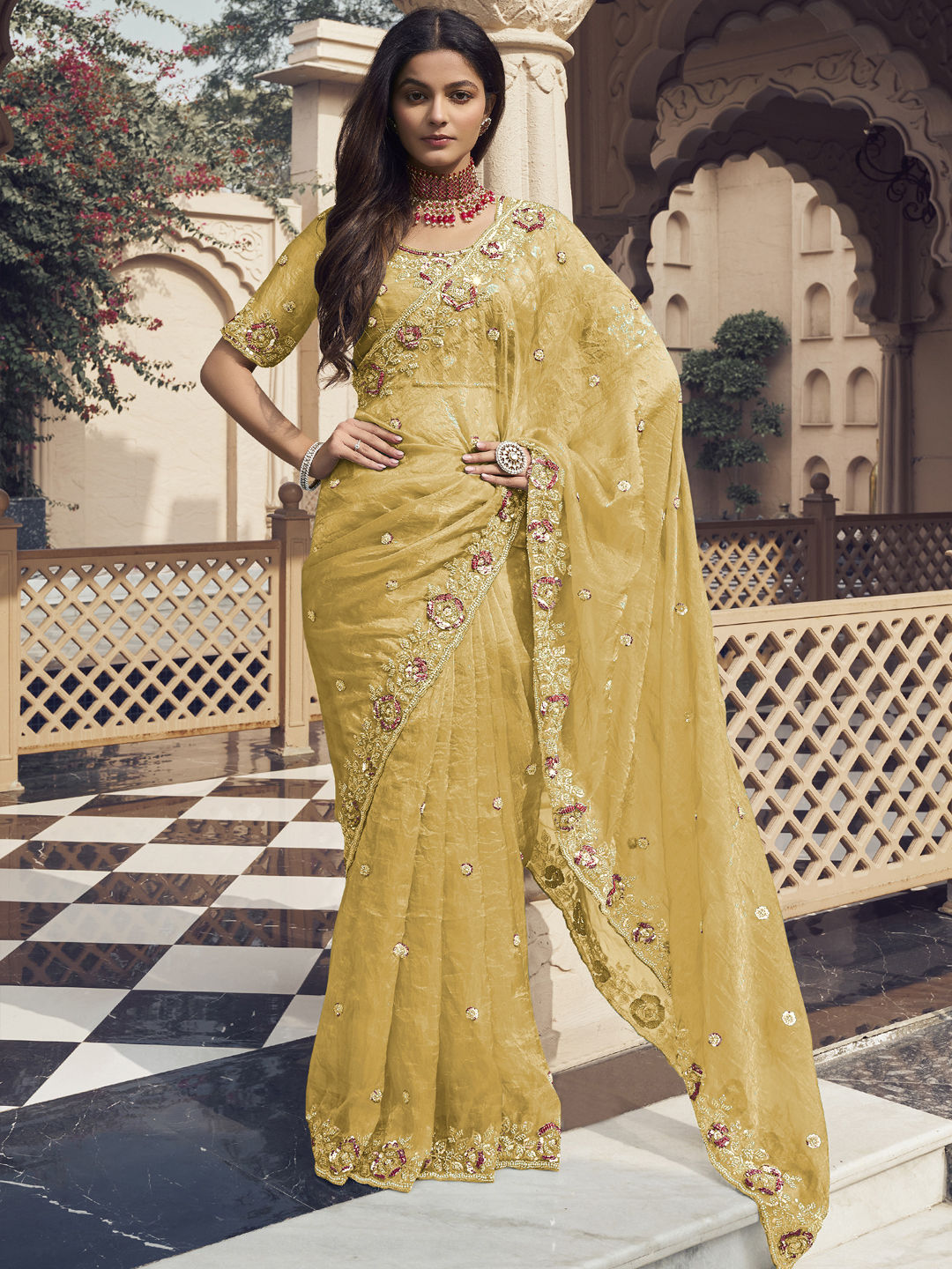 Yellow color Saree in Silk fabric with Bugle Beads, Cut Dana, Sequence work