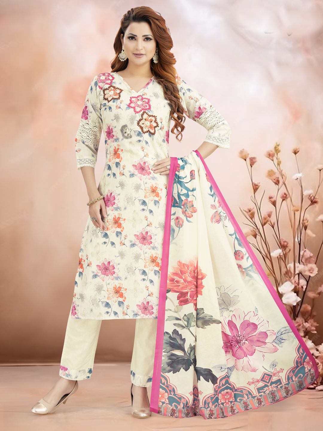White and Off White color Salwar Kameez in Silk fabric with Embroidered, Floral, Printed work