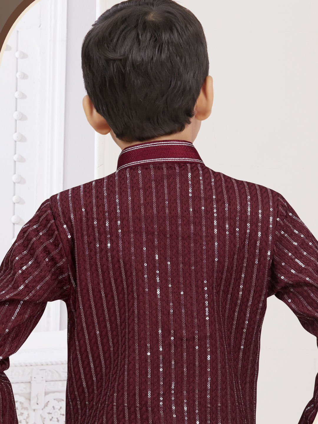 Red and Maroon color Boys Dhoti Sherwani in Silk fabric with Stone, Thread work