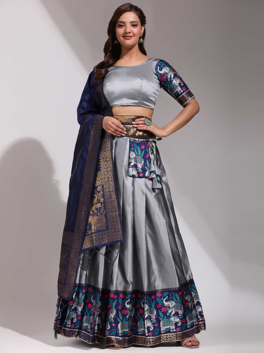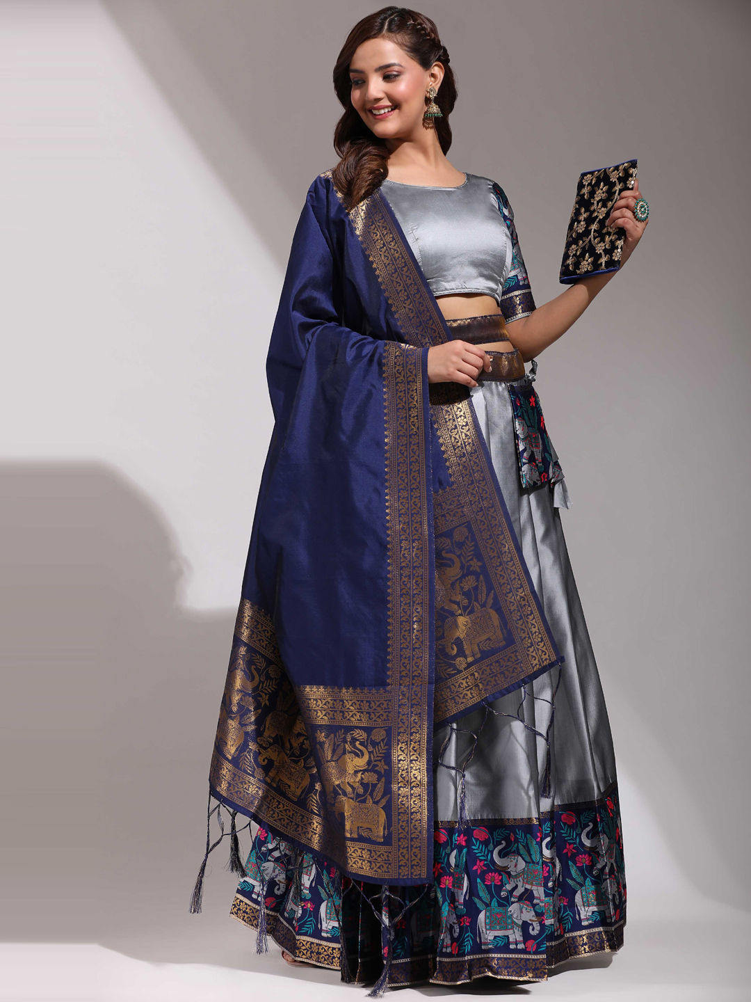 Black and Grey color Lehenga in Silk fabric with Weaving, Zari work