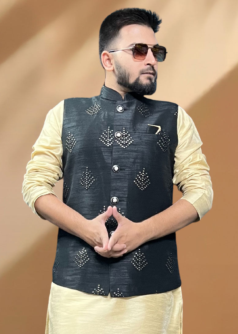 Silk Party Wear Nehru Jacket in Gold with Lace work