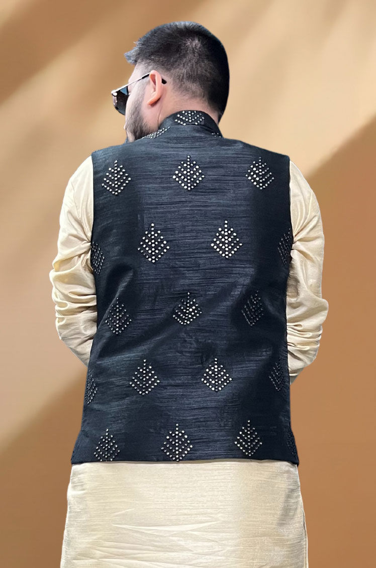 Black and Grey color Nehru Jacket in Silk fabric with Embroidered, Sequence, Thread work