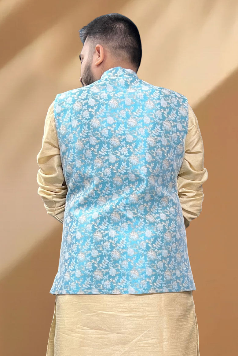 Silk Party Wear Nehru Jacket in Blue with Thread work