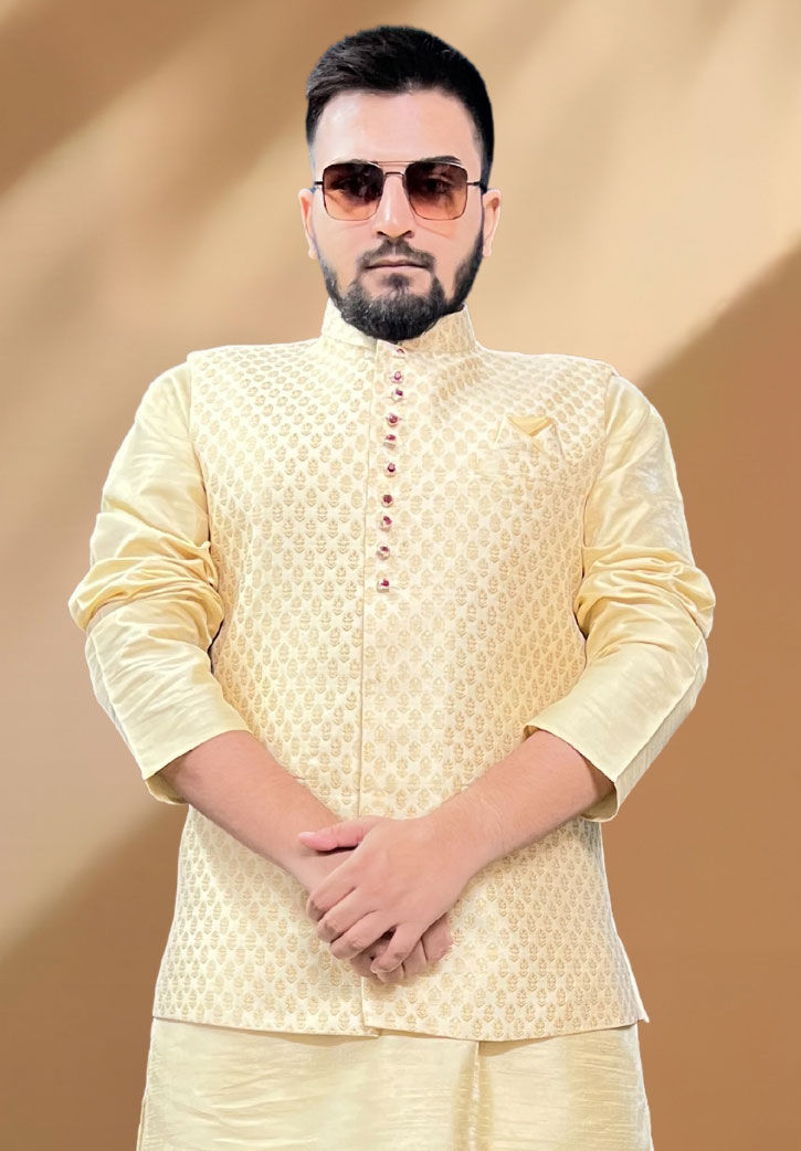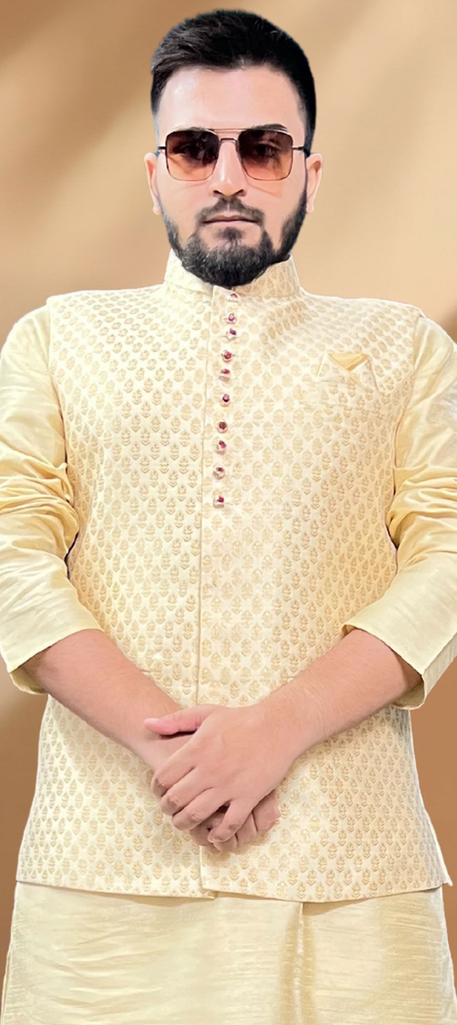 Gold color Nehru Jacket in Silk fabric with Thread work