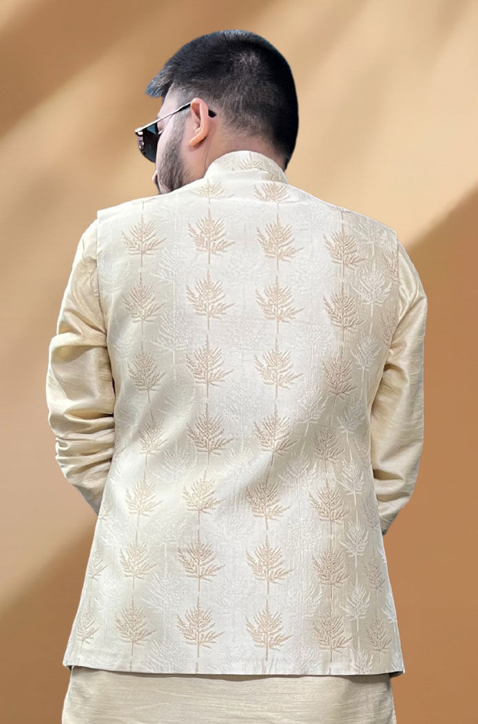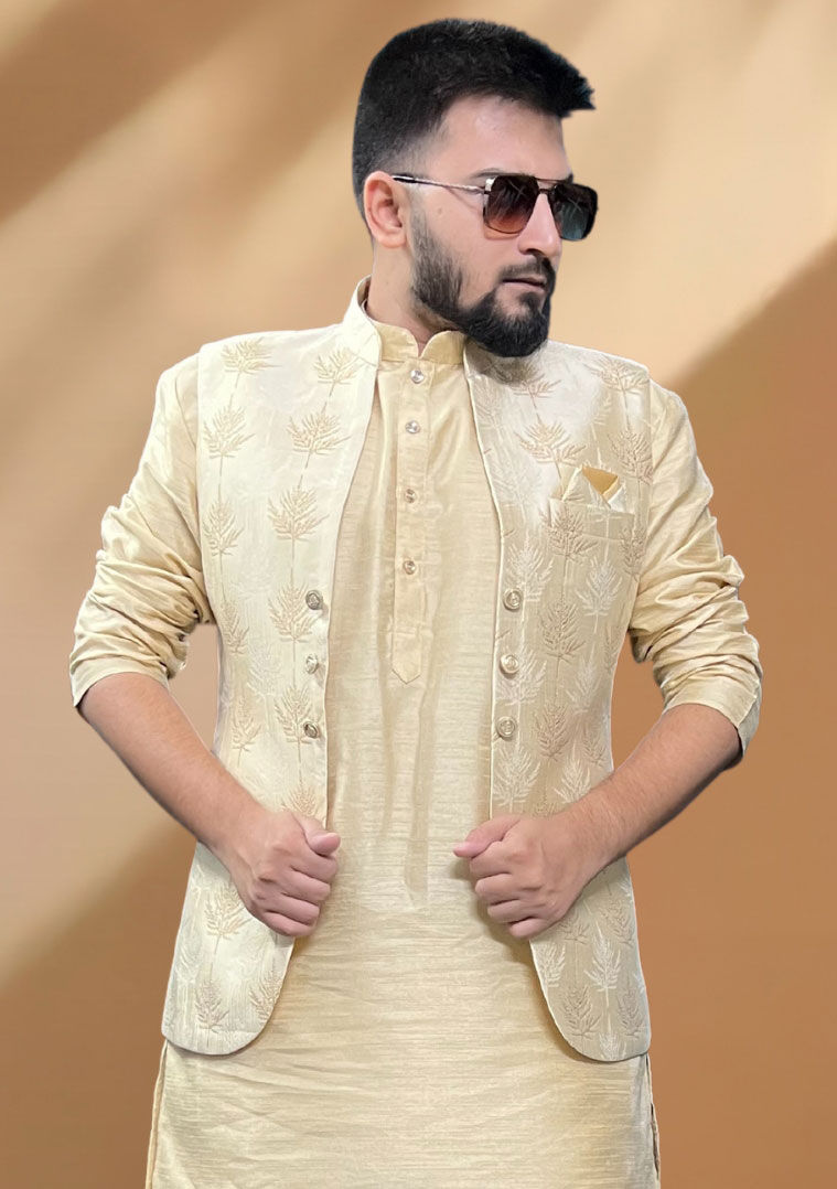 Gold color Nehru Jacket in Silk fabric with Thread work