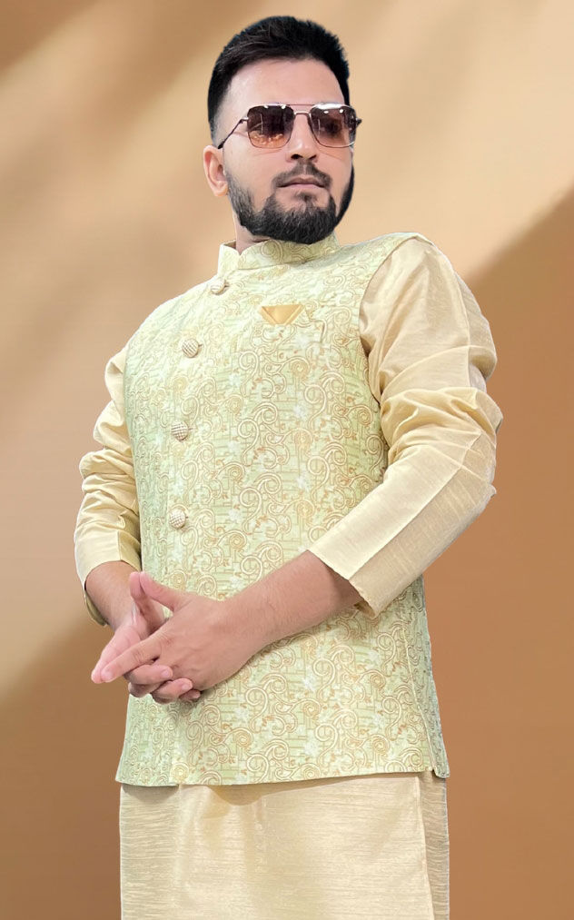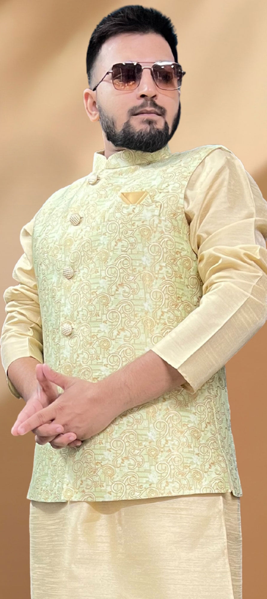 Silk Party Wear Nehru Jacket in Gold with Lace work