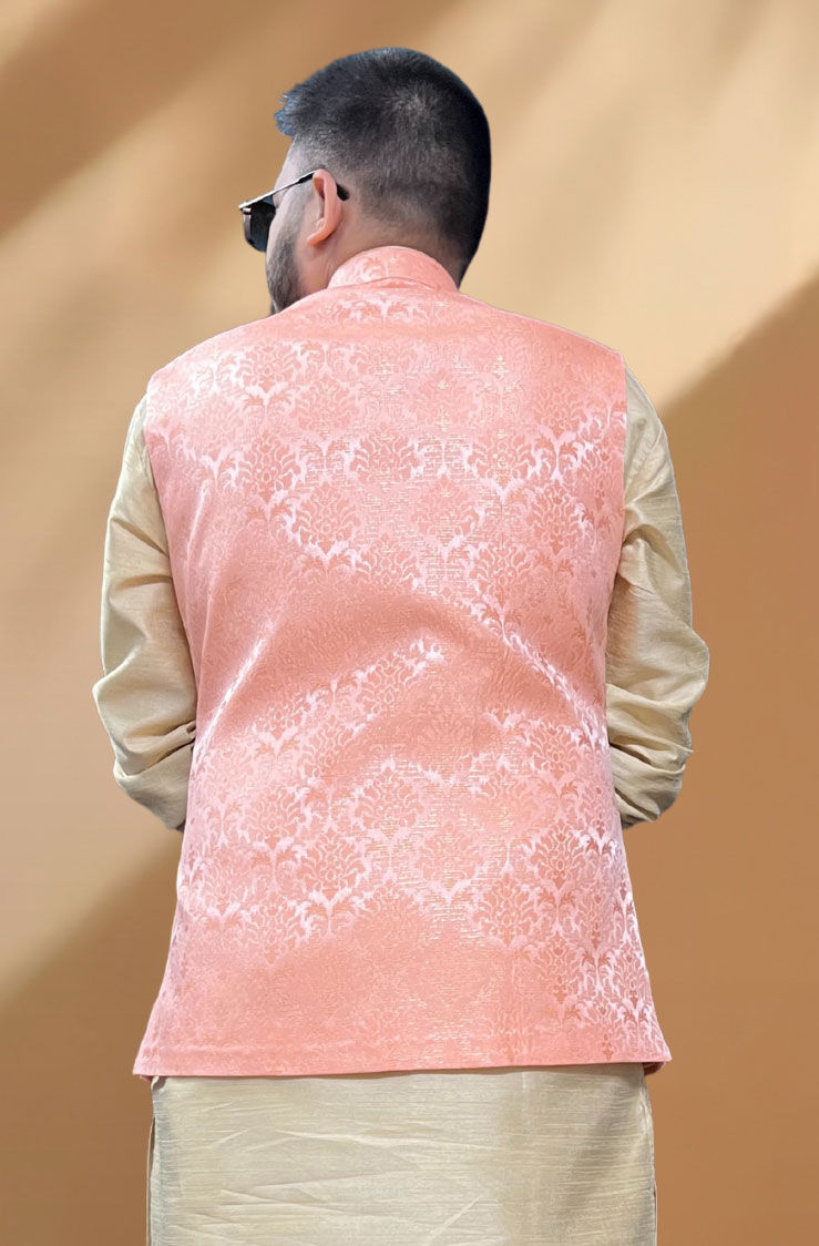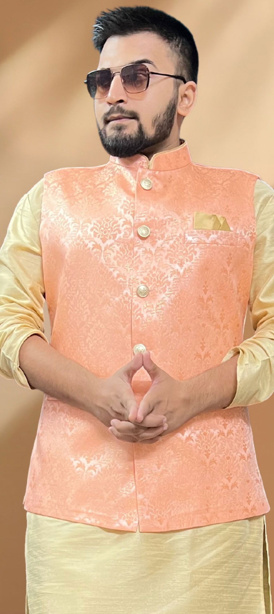 Silk Party Wear Nehru Jacket in Gold with Lace work