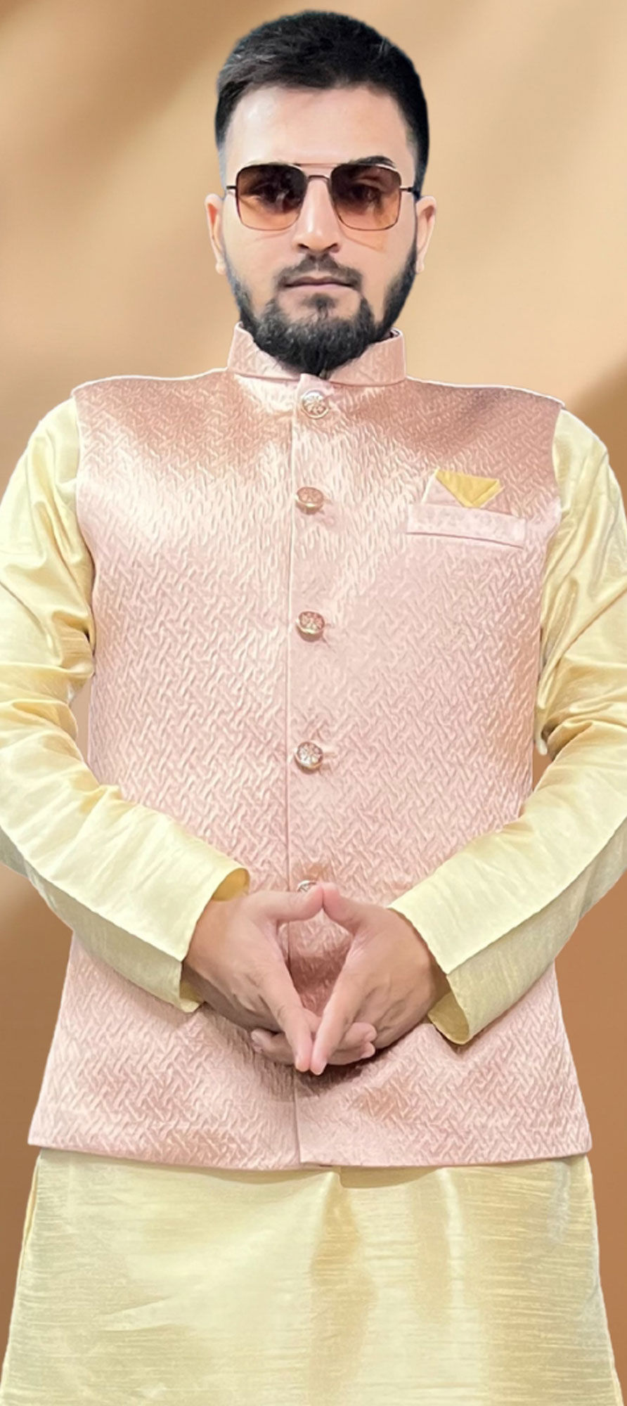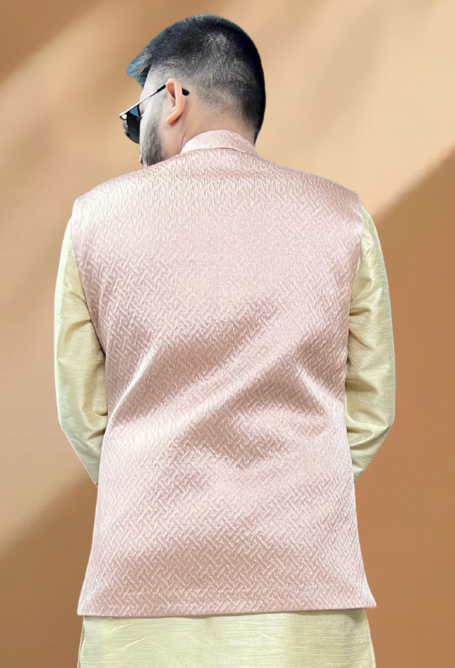 Silk Party Wear Nehru Jacket in Gold with Lace work