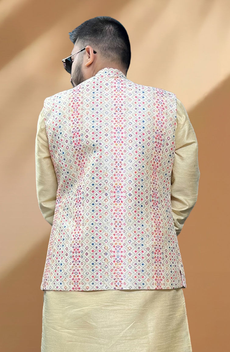 White and Off White color Nehru Jacket in Silk fabric with Embroidered, Sequence, Thread work