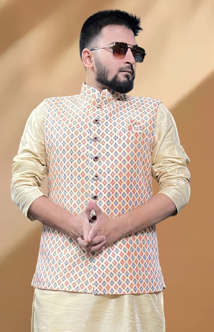 Silk Party Wear Nehru Jacket in Gold with Lace work