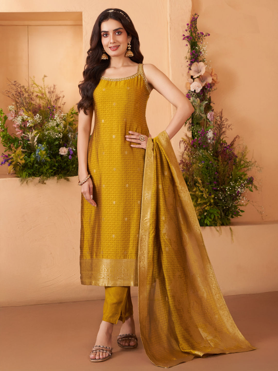 Gold color Salwar Kameez in Silk fabric with Stone, Thread work