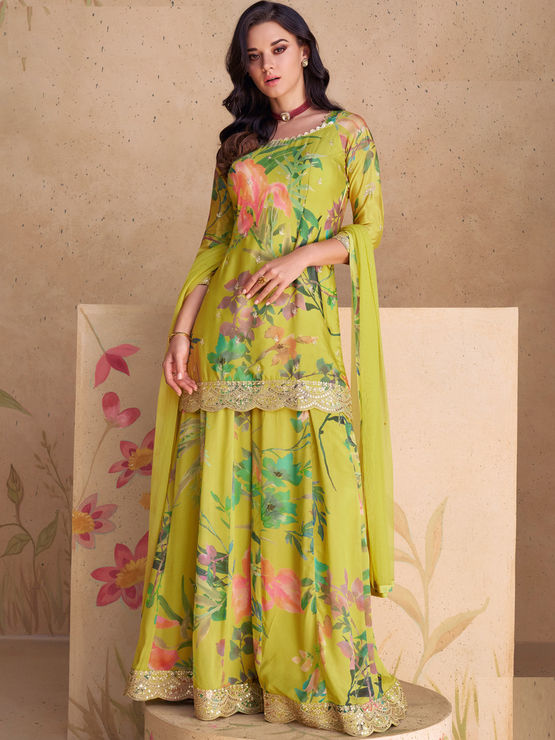 Green color Salwar Kameez in Silk fabric with Digital Print, Embroidered, Floral, Sequence work